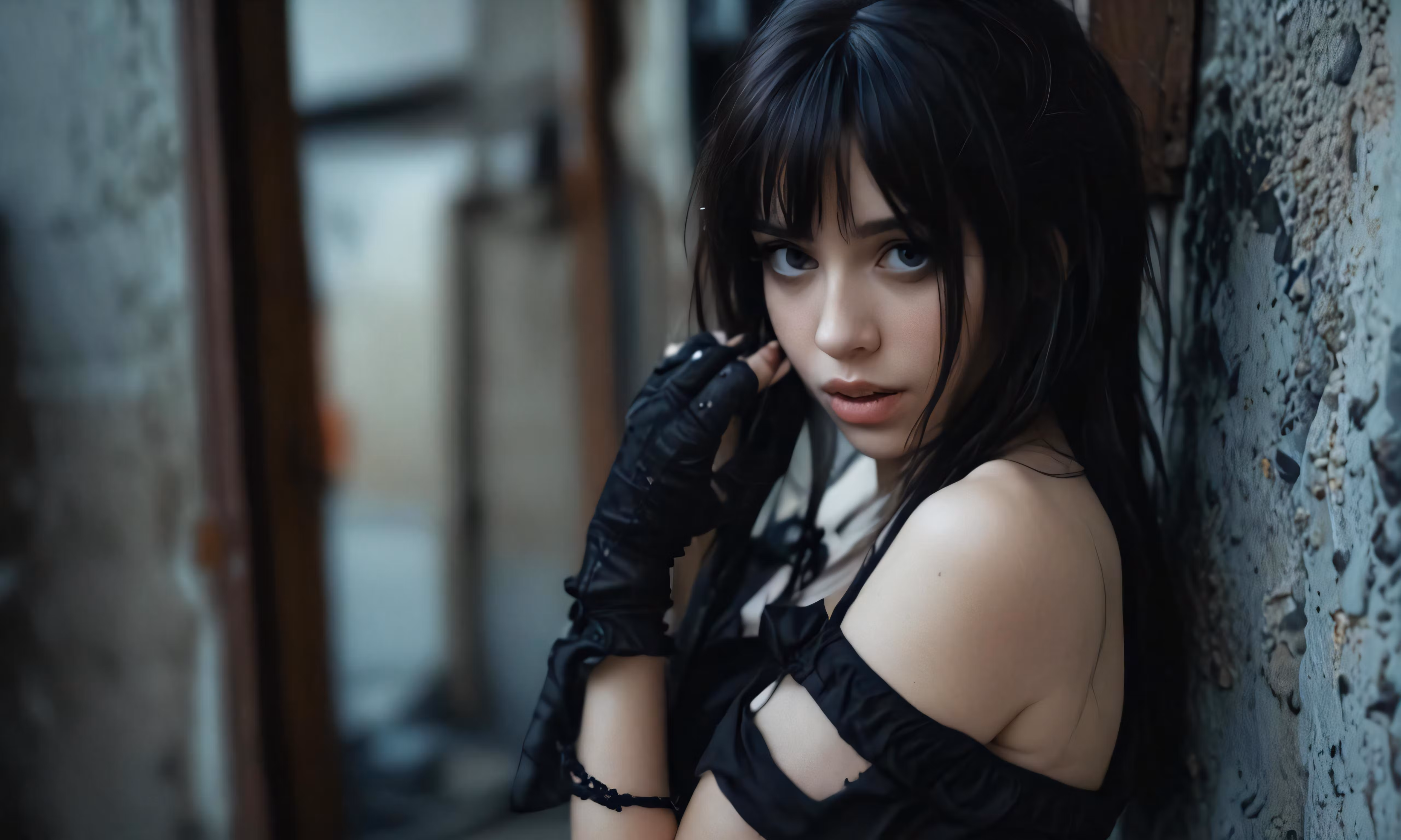 High resolution picture, free to use, a woman in a black dress and gloves is leaning against a wall