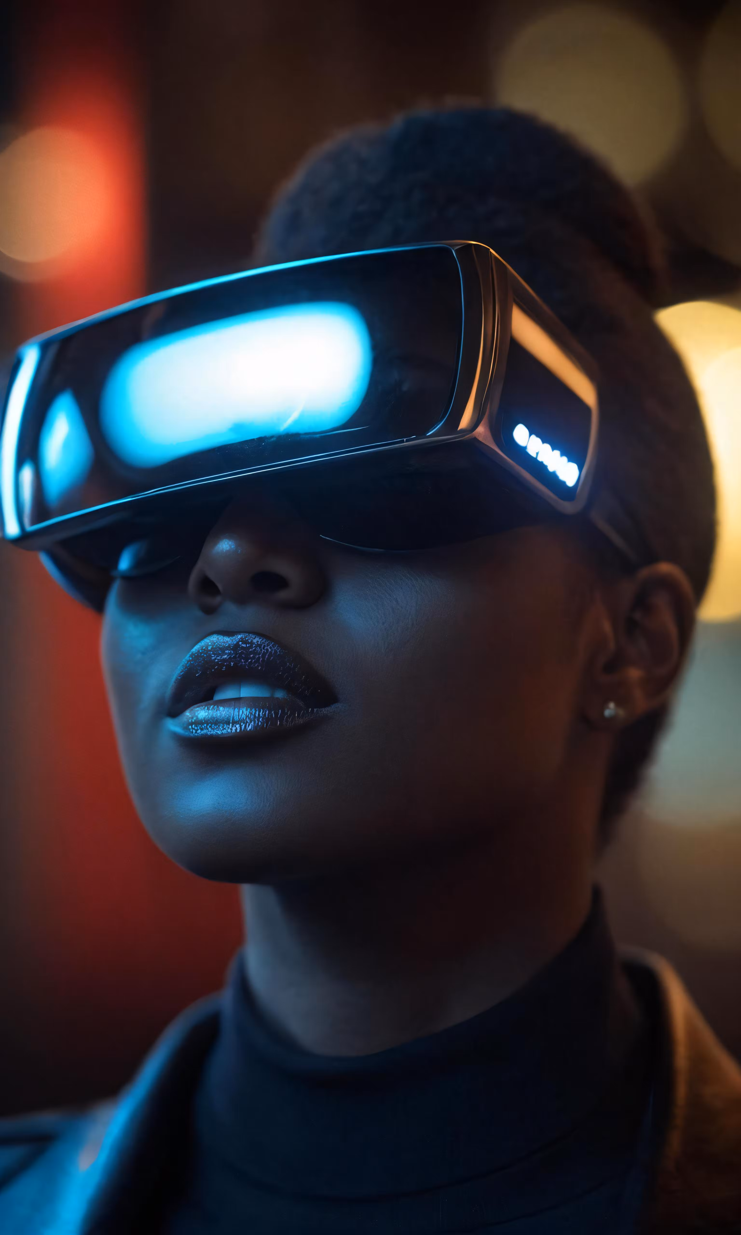 High resolution picture, free to use, a woman in a black top and a glowing virtual device