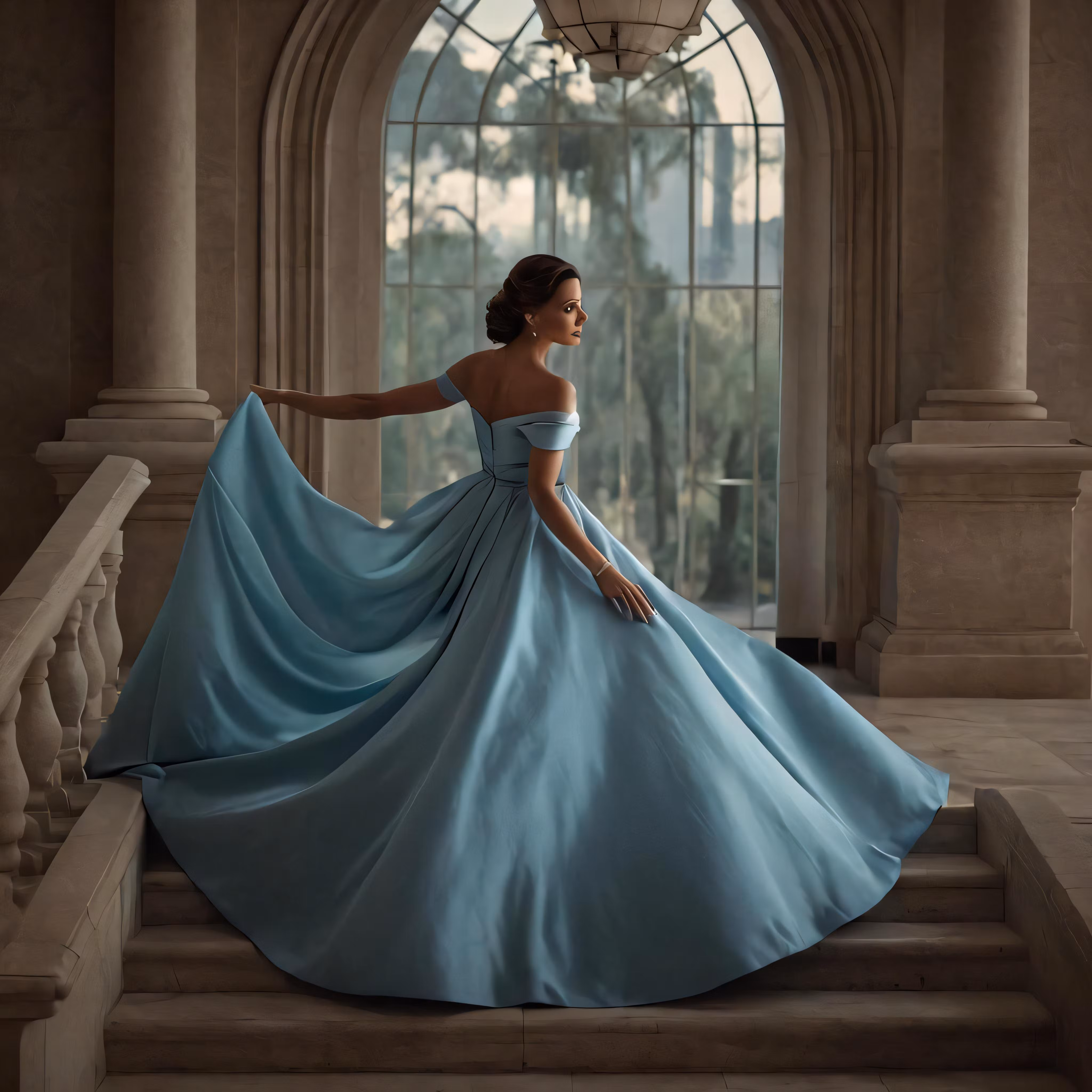 High resolution picture, free to use, a woman in a blue gown is sitting on some steps