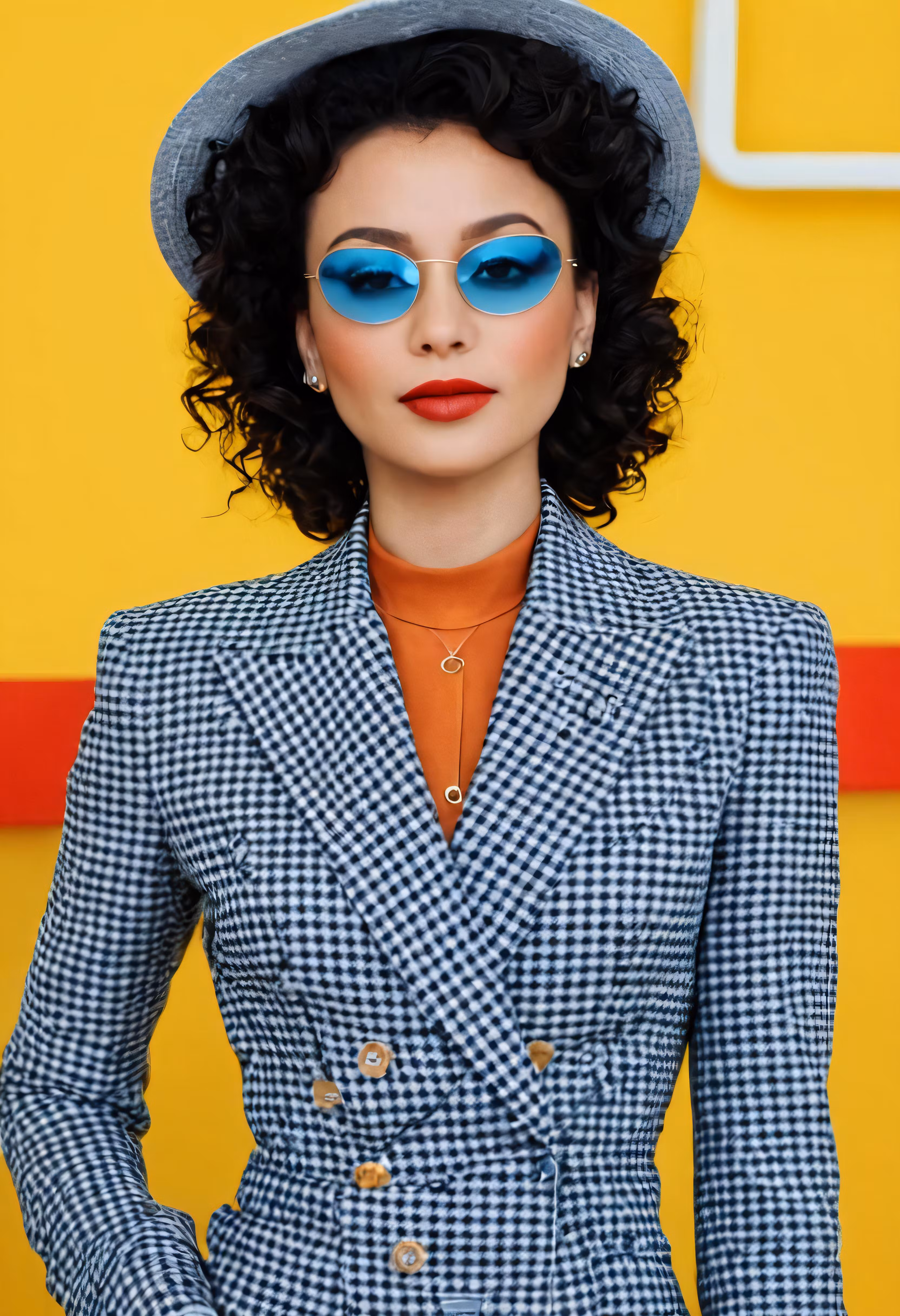 High resolution picture, free to use, a woman in a blue outfit and gray hat