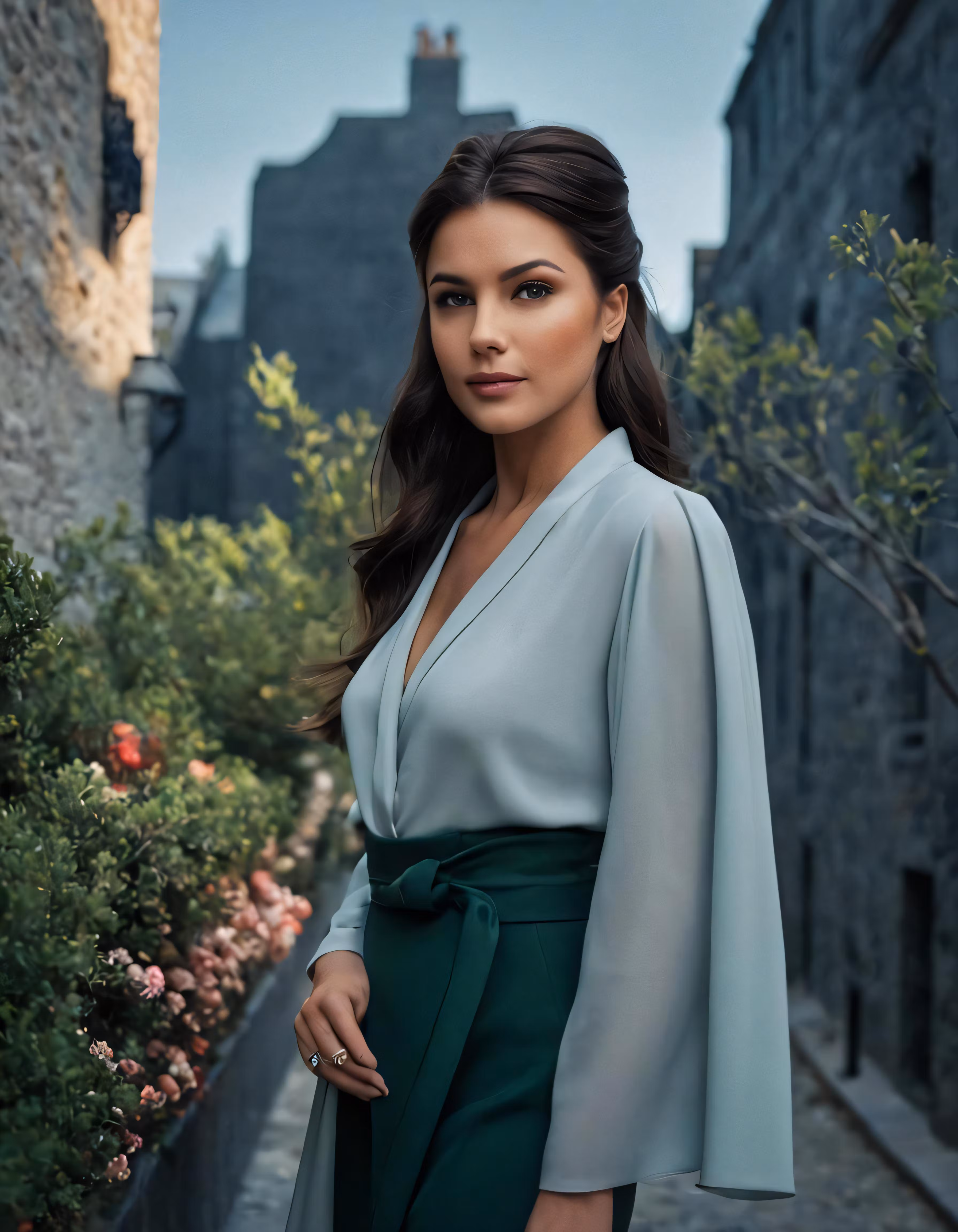 High resolution picture, free to use, a woman in a blue top standing near a brick walkway