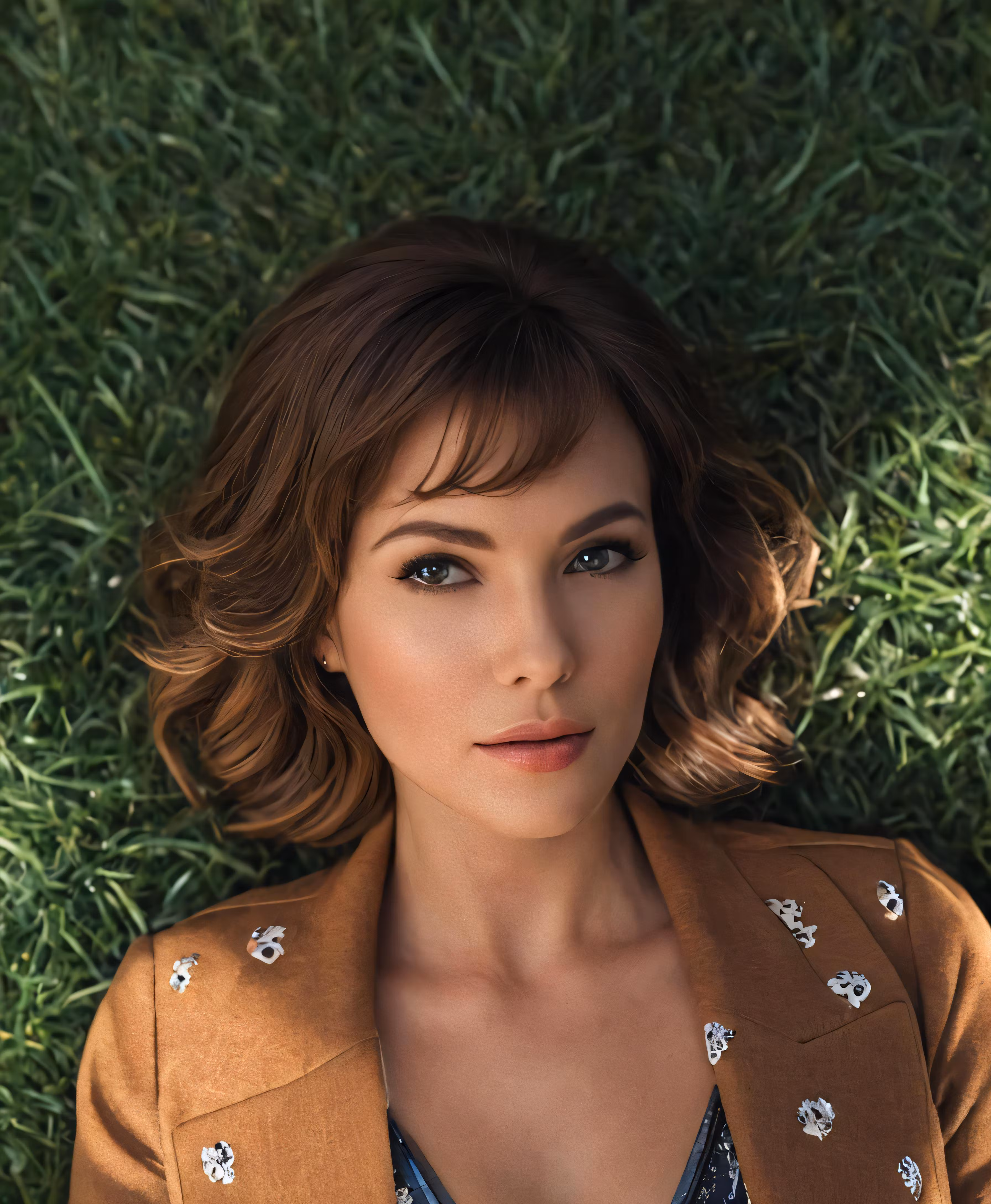 High resolution picture, free to use, a woman in a brown blazer standing on top of grass
