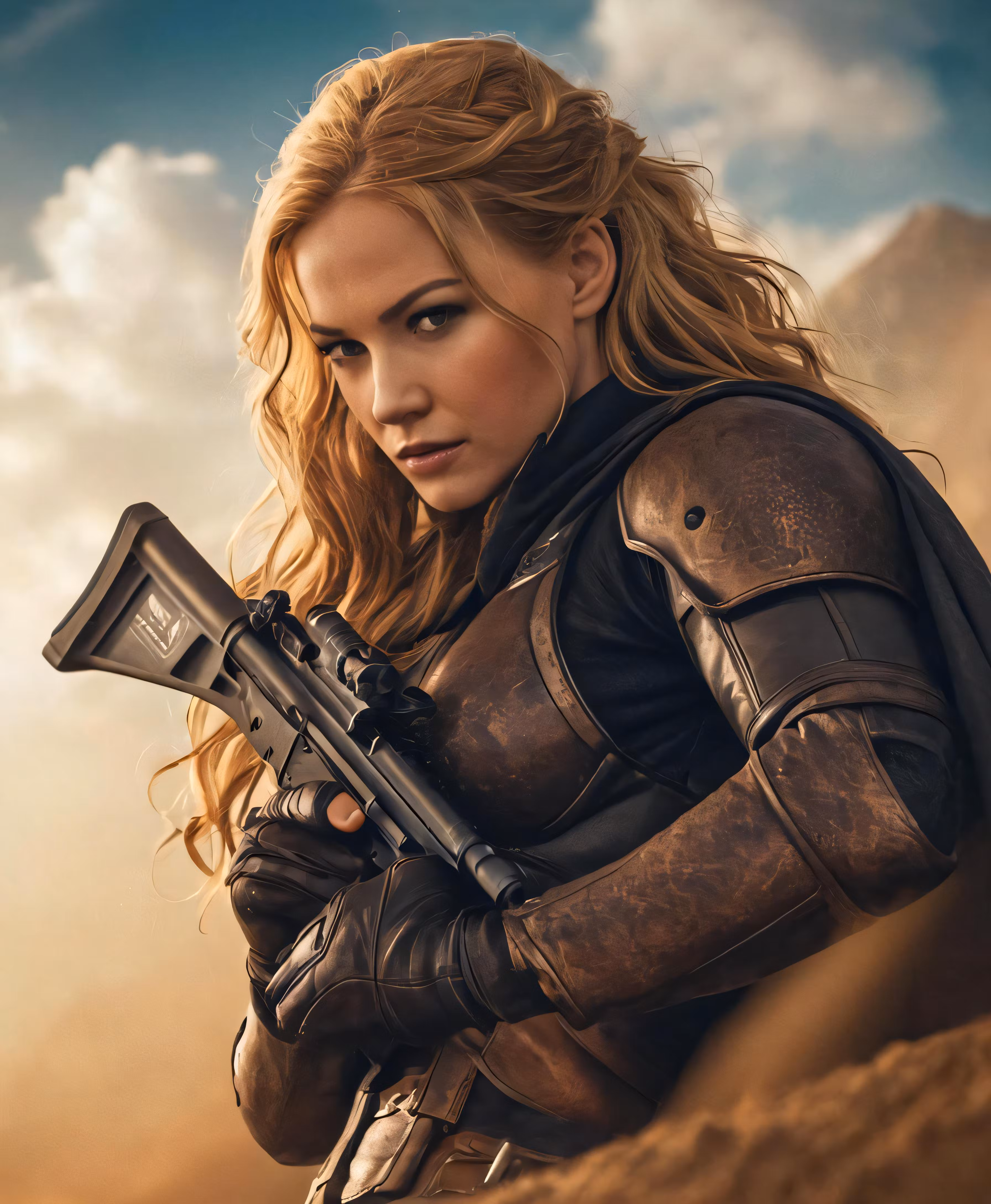 High resolution picture, free to use, a woman in a brown leather outfit holding a gun