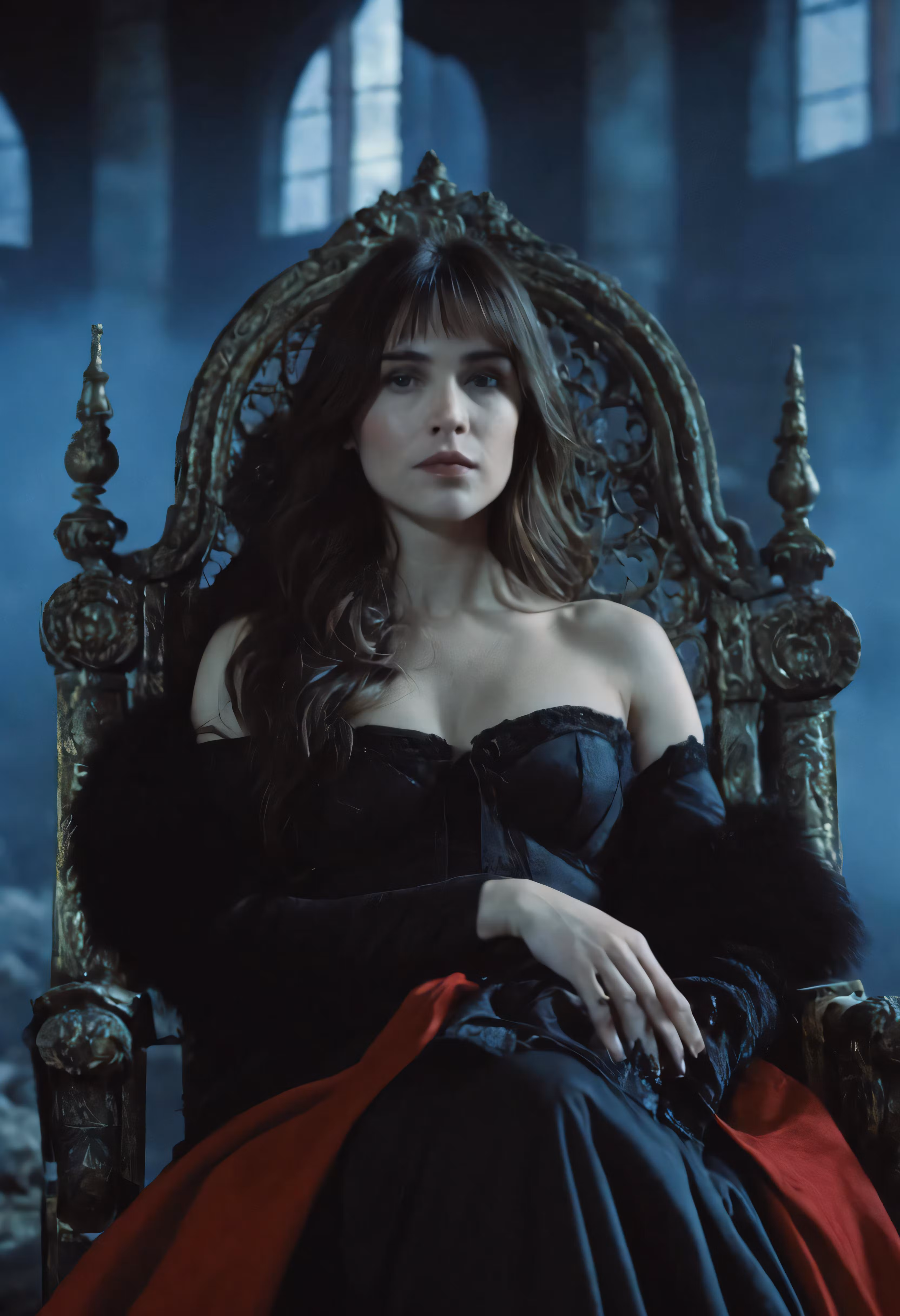 High resolution picture, free to use, a woman in a corset and gown sitting on a golden throne