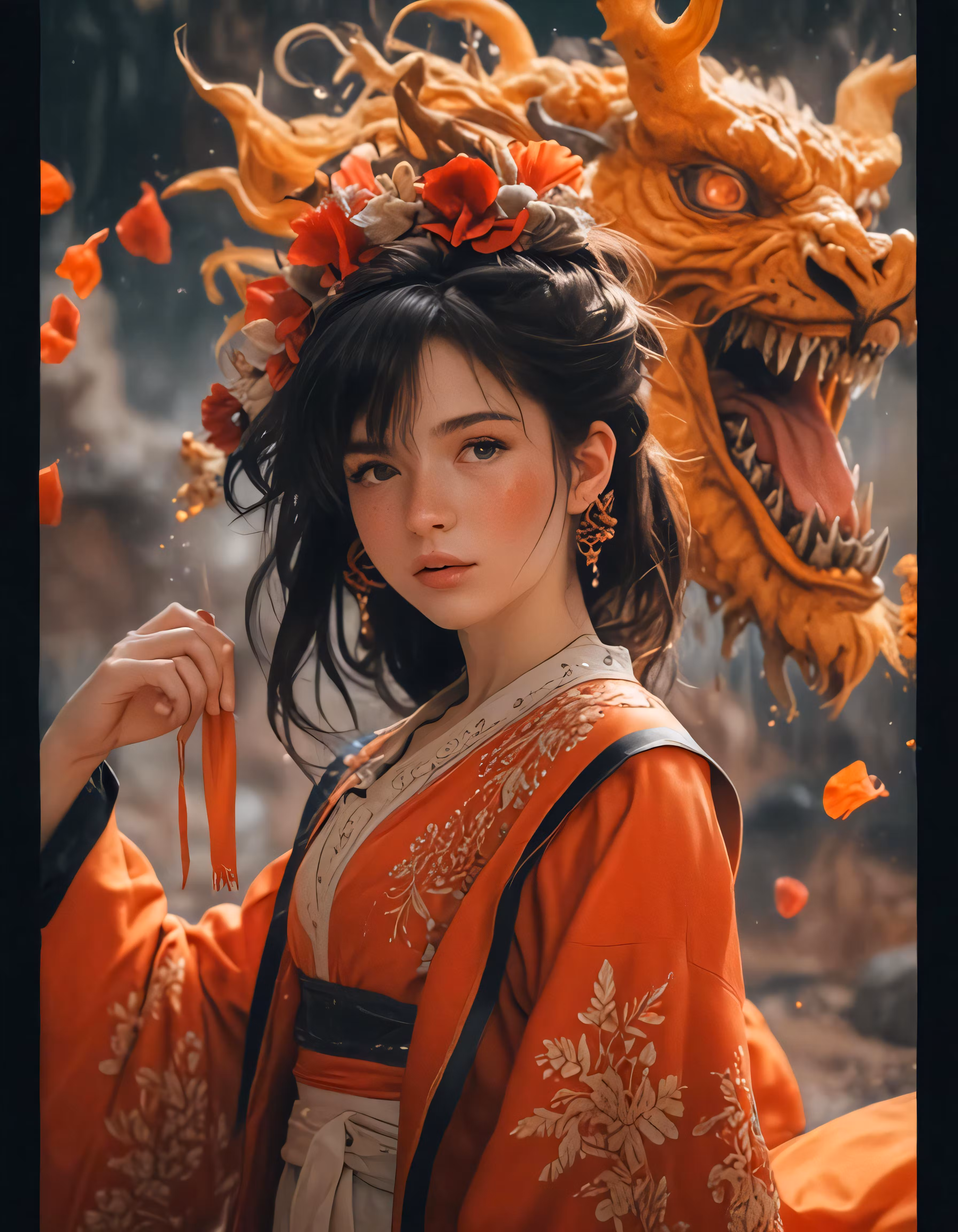 High resolution picture, free to use, a woman in a dress and dragon headdress