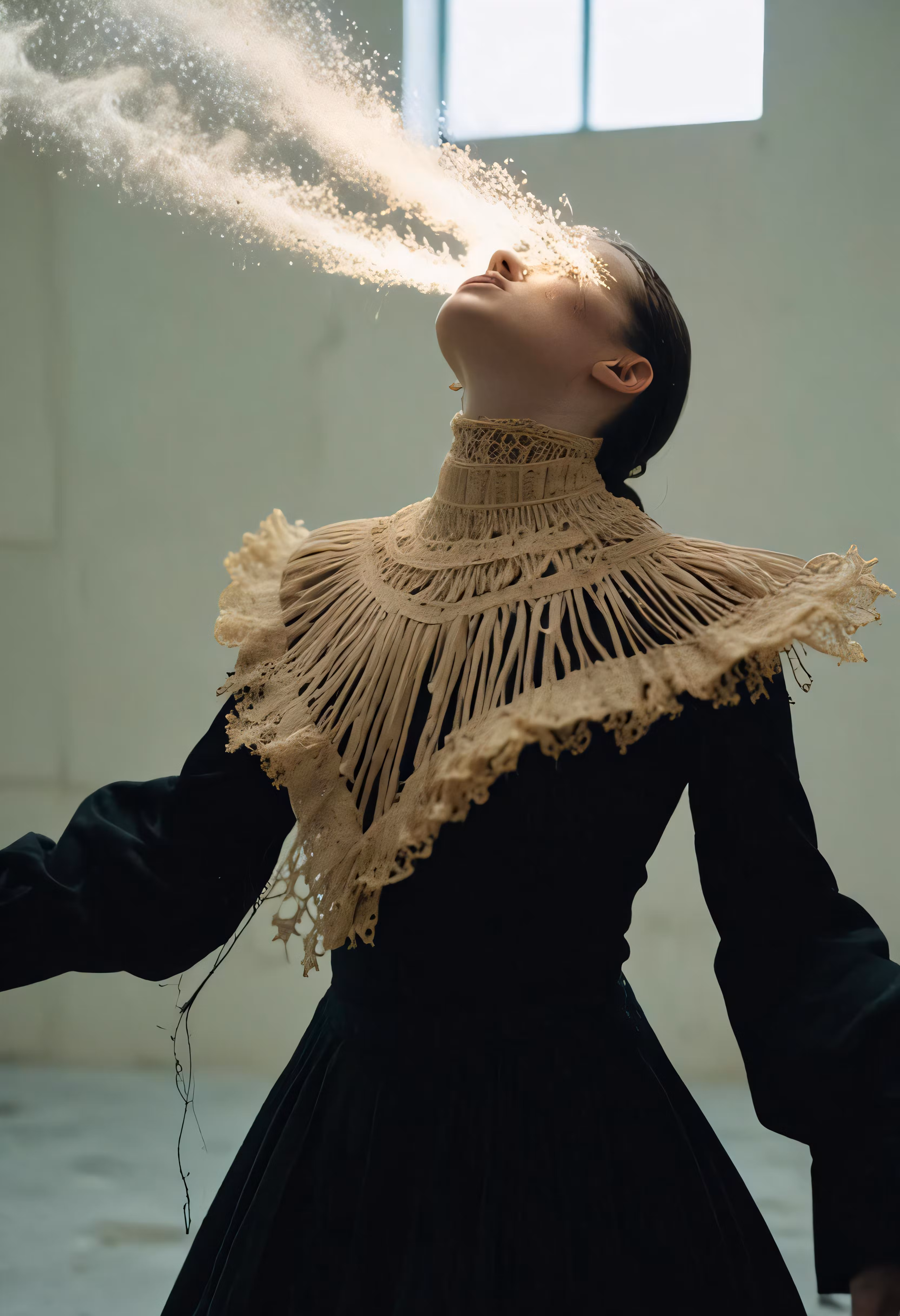 High resolution picture, free to use, a woman in a dress blowing dust up with her hands