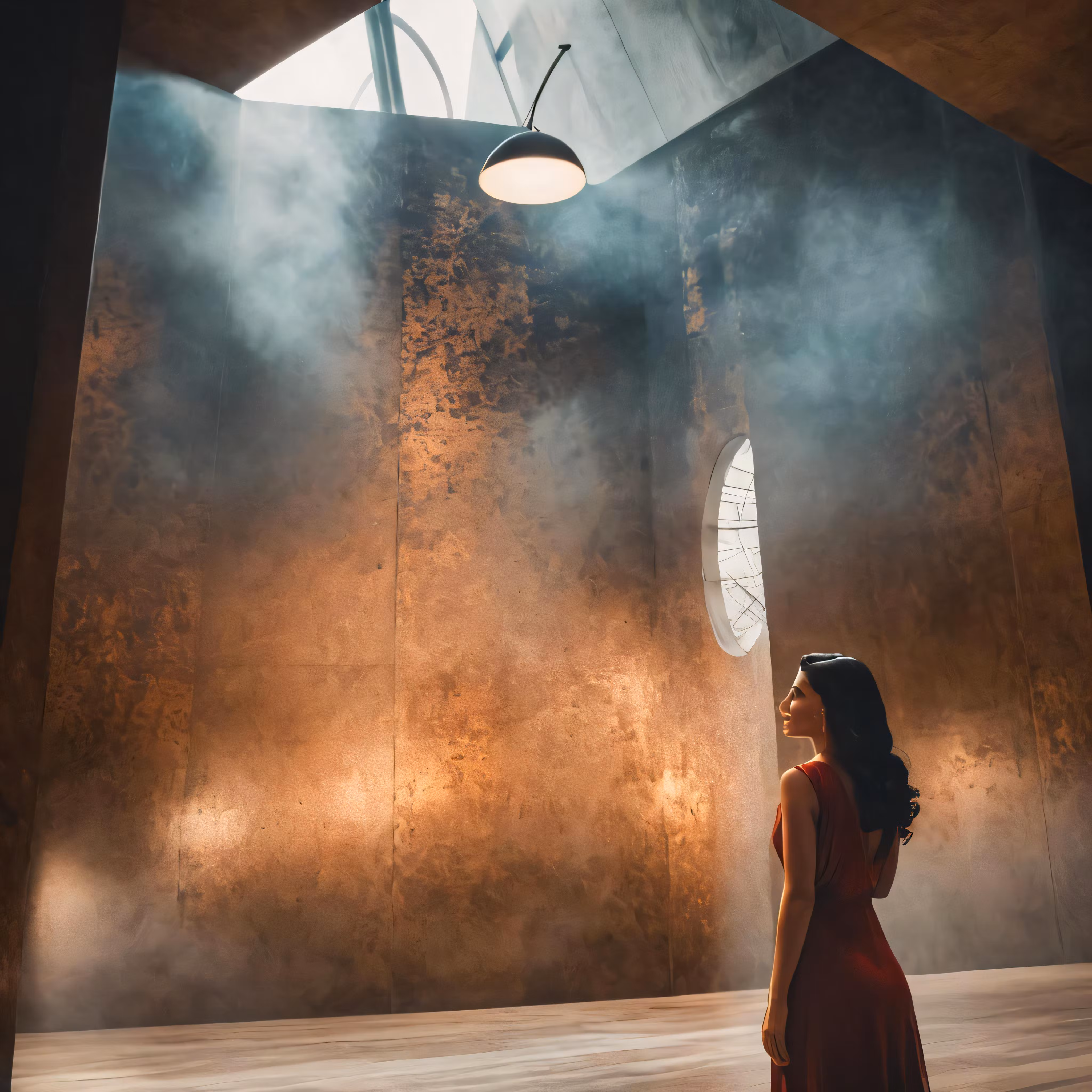 High resolution picture, free to use, a woman in a dress standing in a dimly lit room