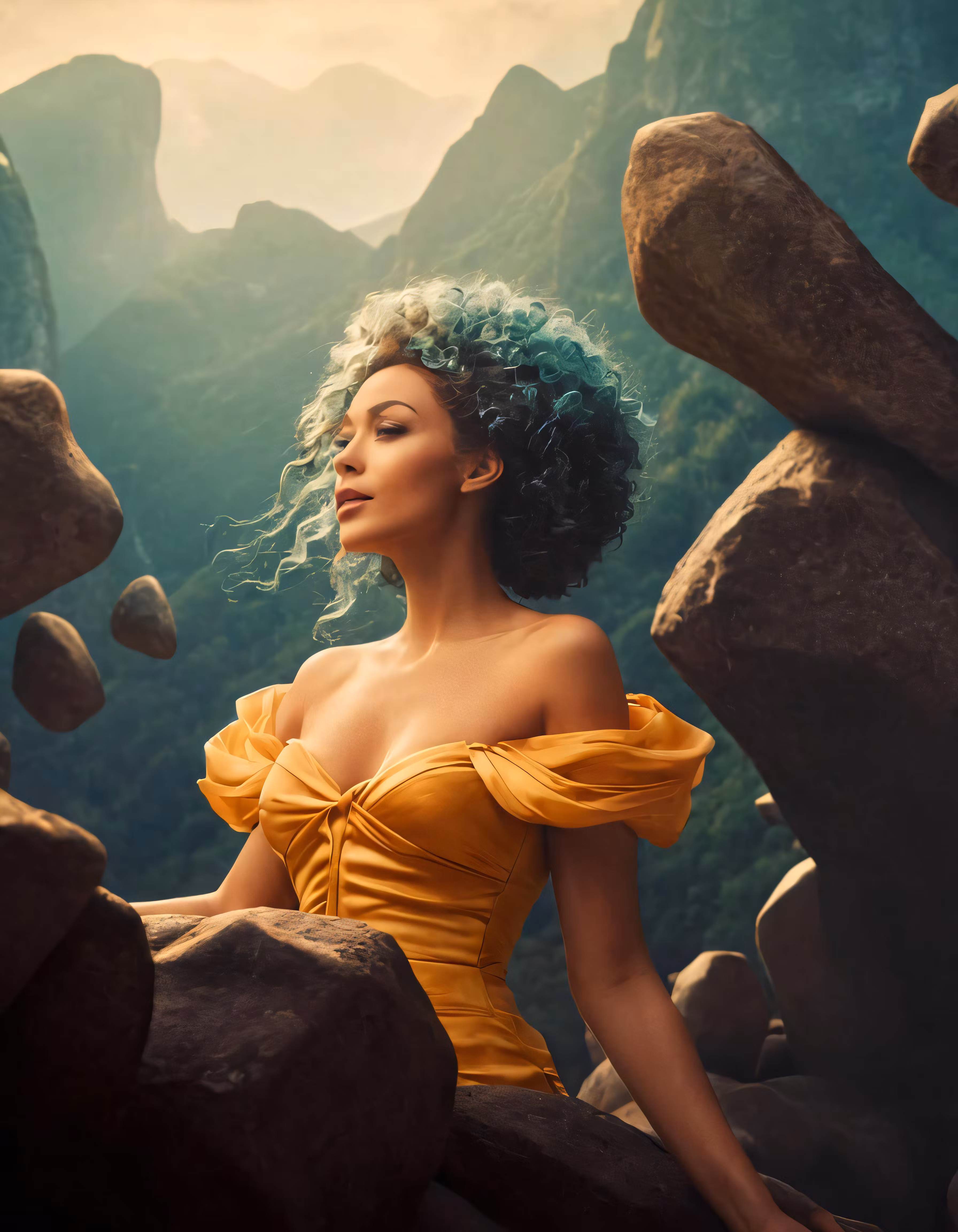 High resolution picture, free to use, a woman in a golden dress near rocks
