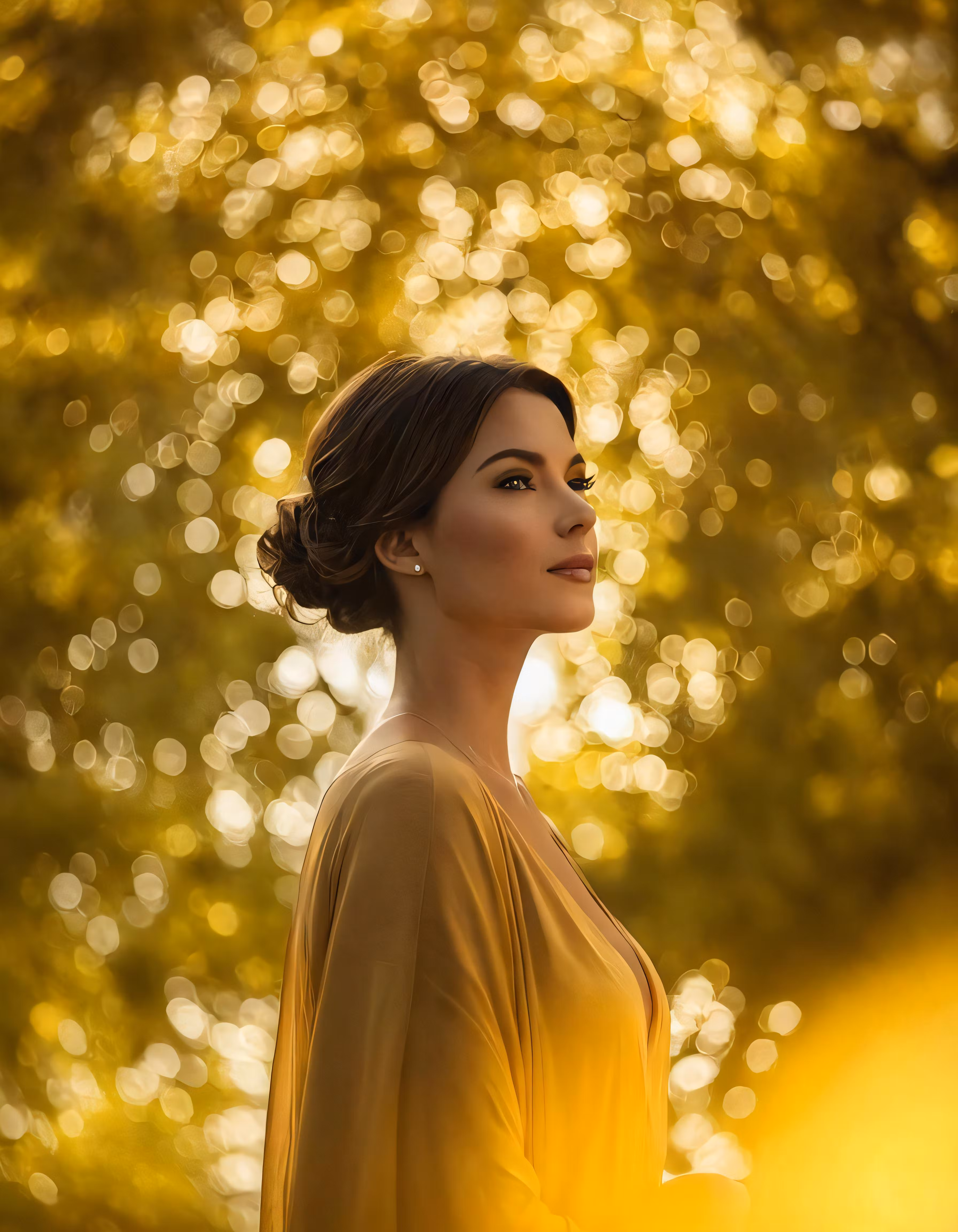 High resolution picture, free to use, a woman in a golden dress with trees in the background