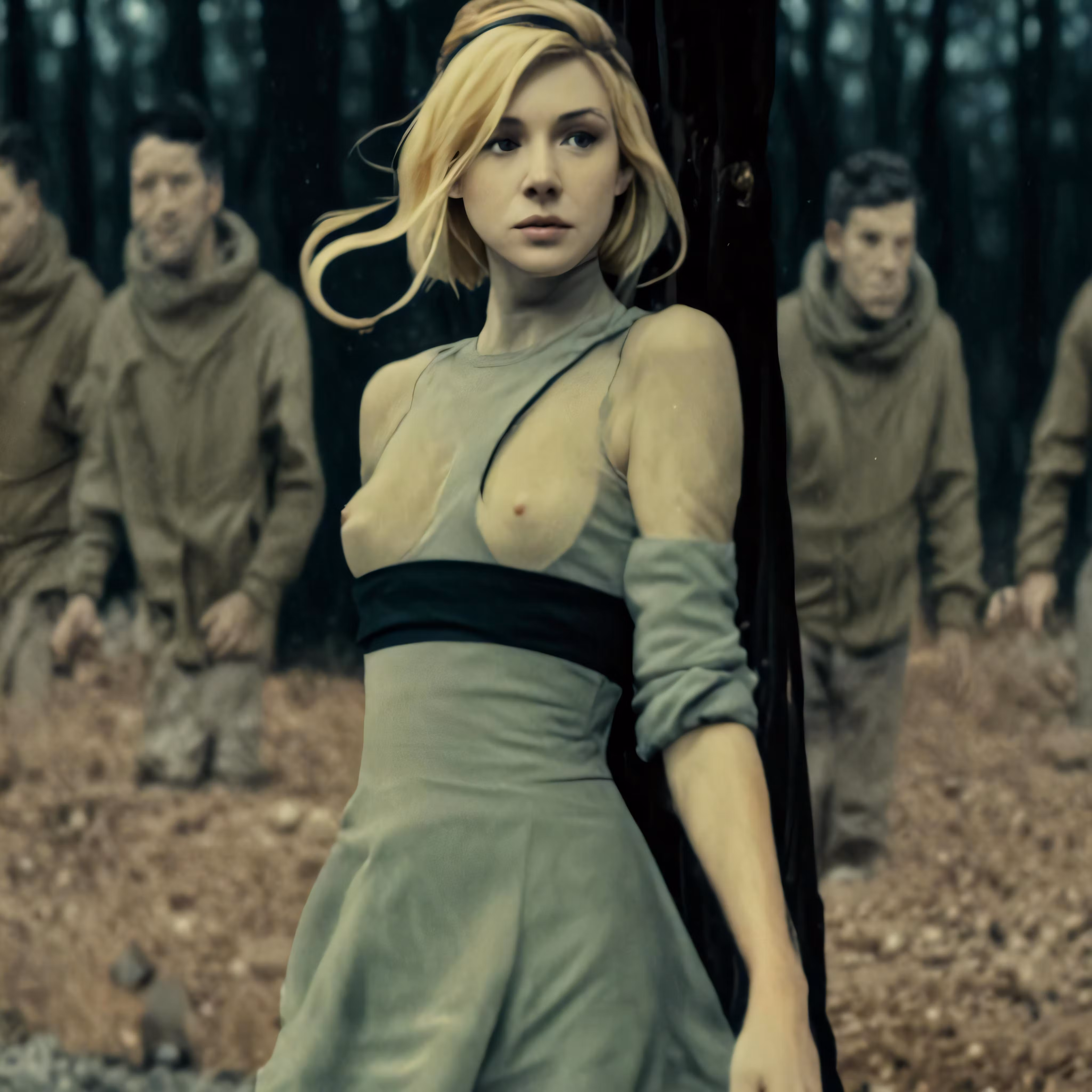 High resolution picture, free to use, a woman in a gray dress standing in front of a group of men