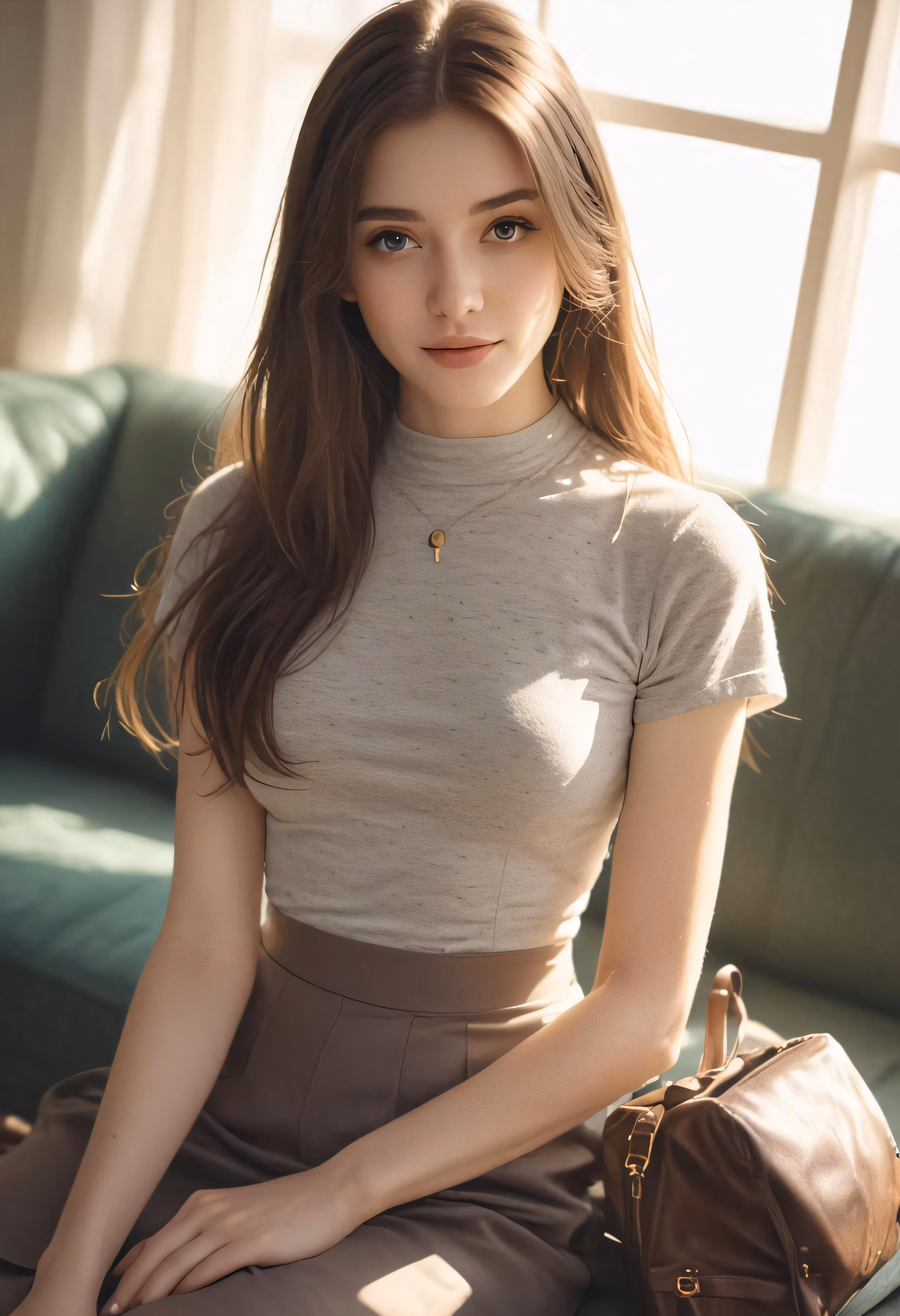 High resolution picture, free to use, a woman in a gray shirt is sitting on the couch