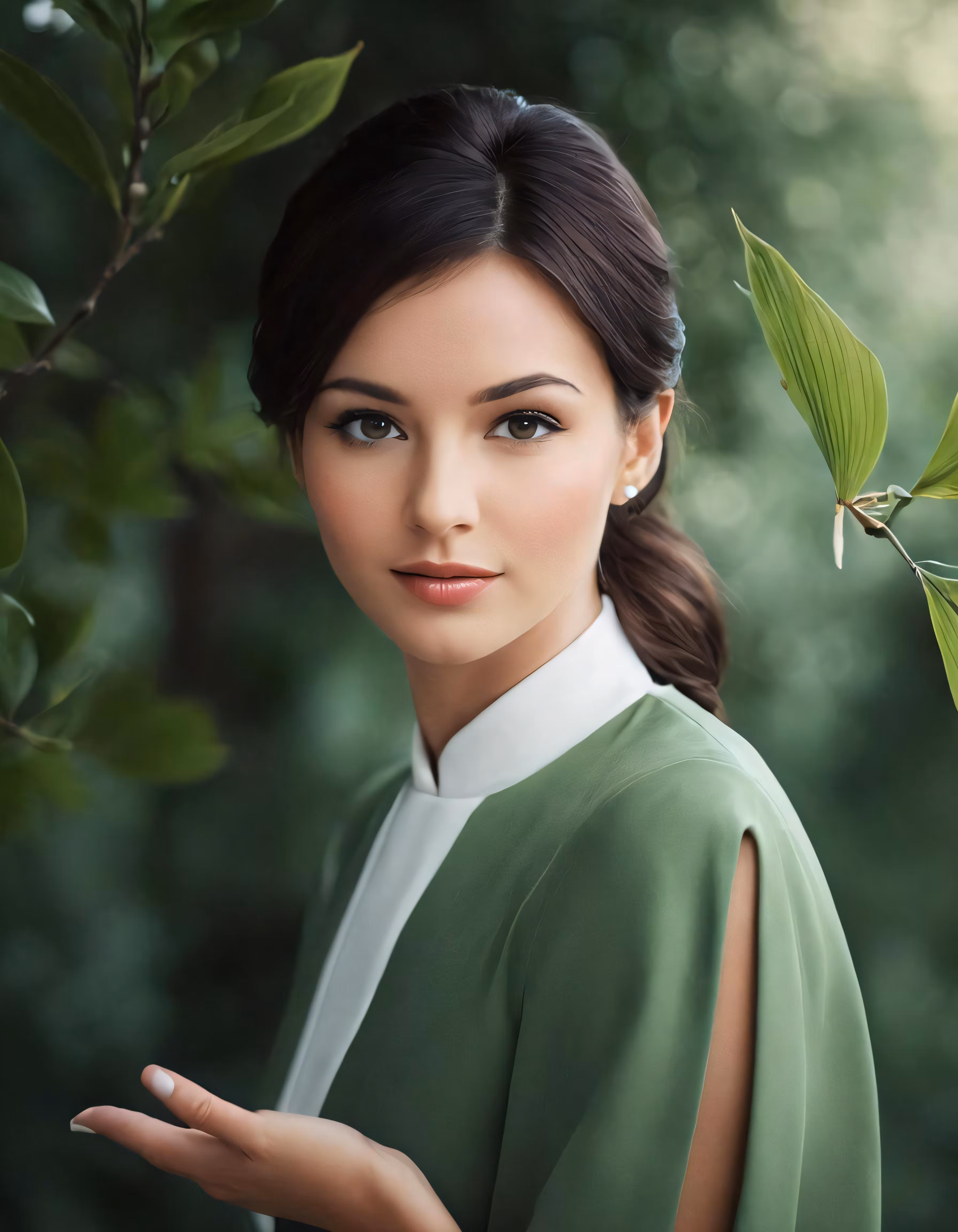High resolution picture, free to use, a woman in a green top holding out her hand