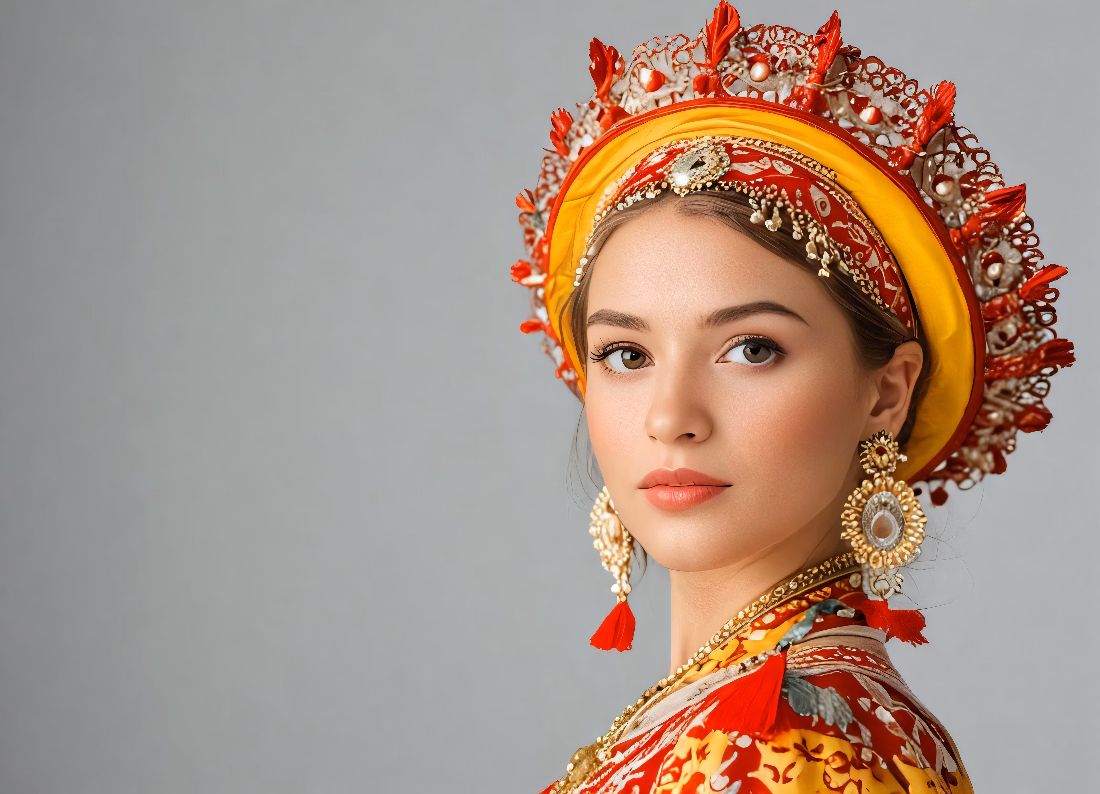 High resolution picture, free to use, a woman in a headdress is looking up