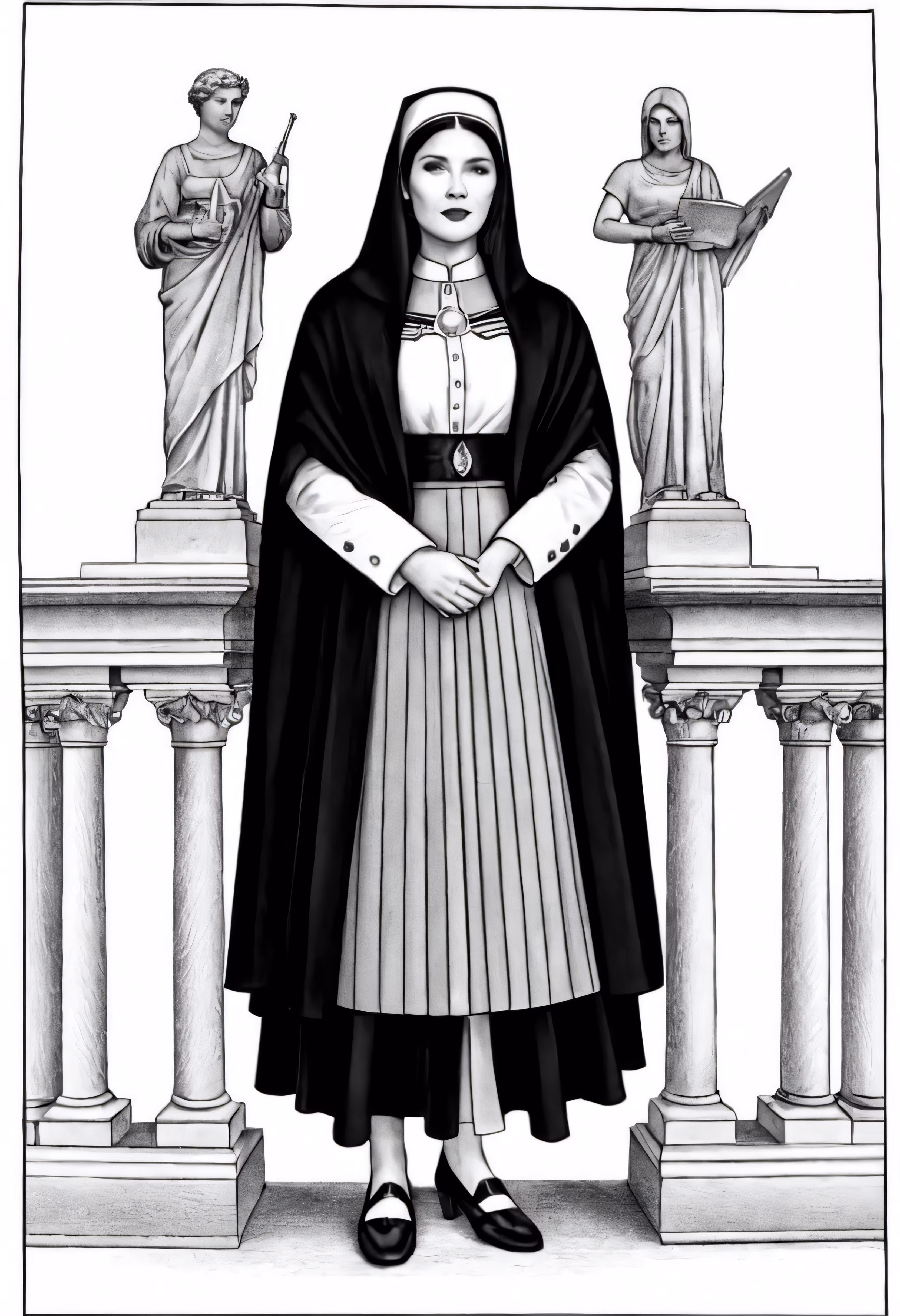 High resolution picture, free to use, a woman in a long skirt with long cape standing near some statues