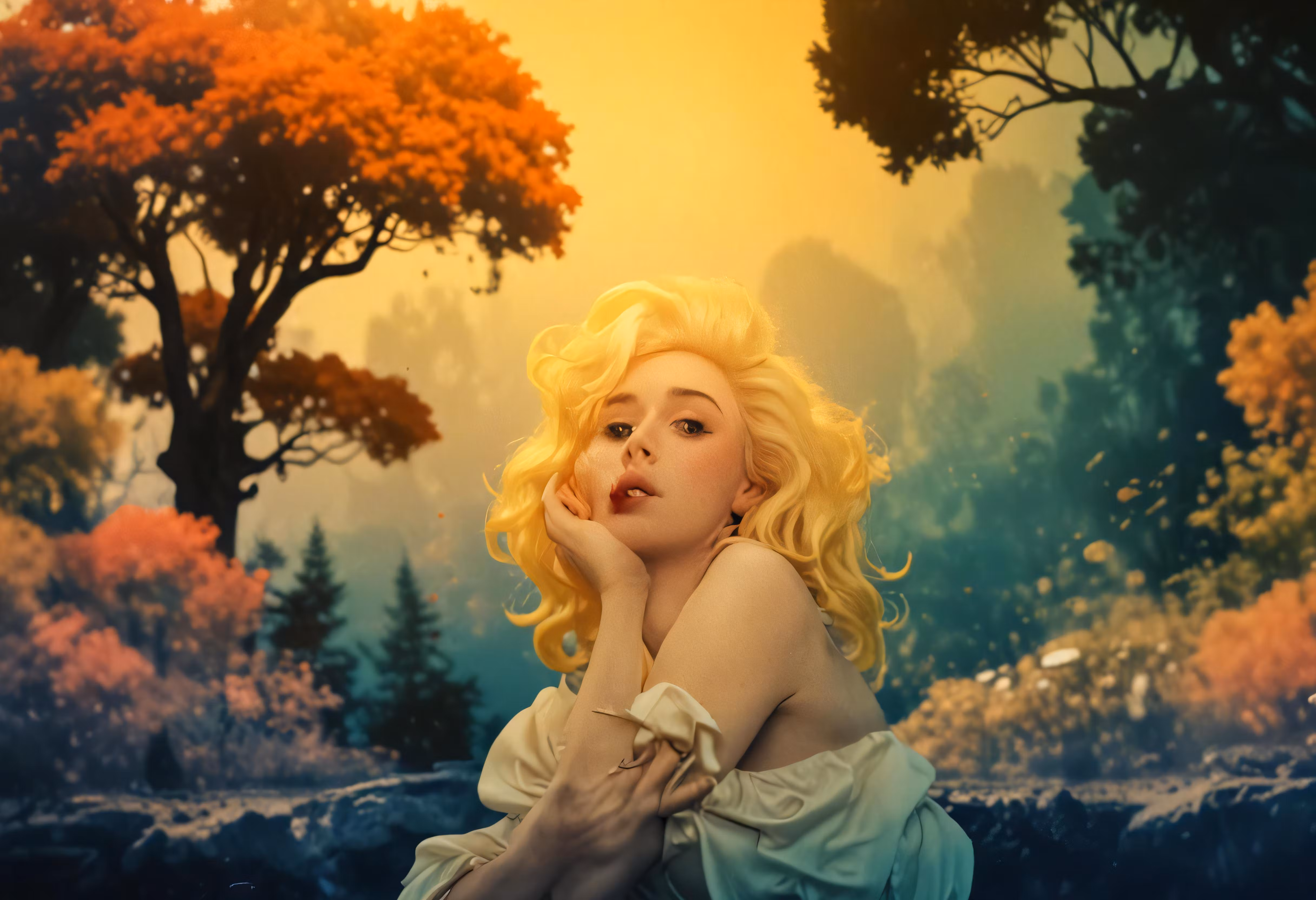 High resolution picture, free to use, a woman in a pastel dress leans to her side with her hands near her face
