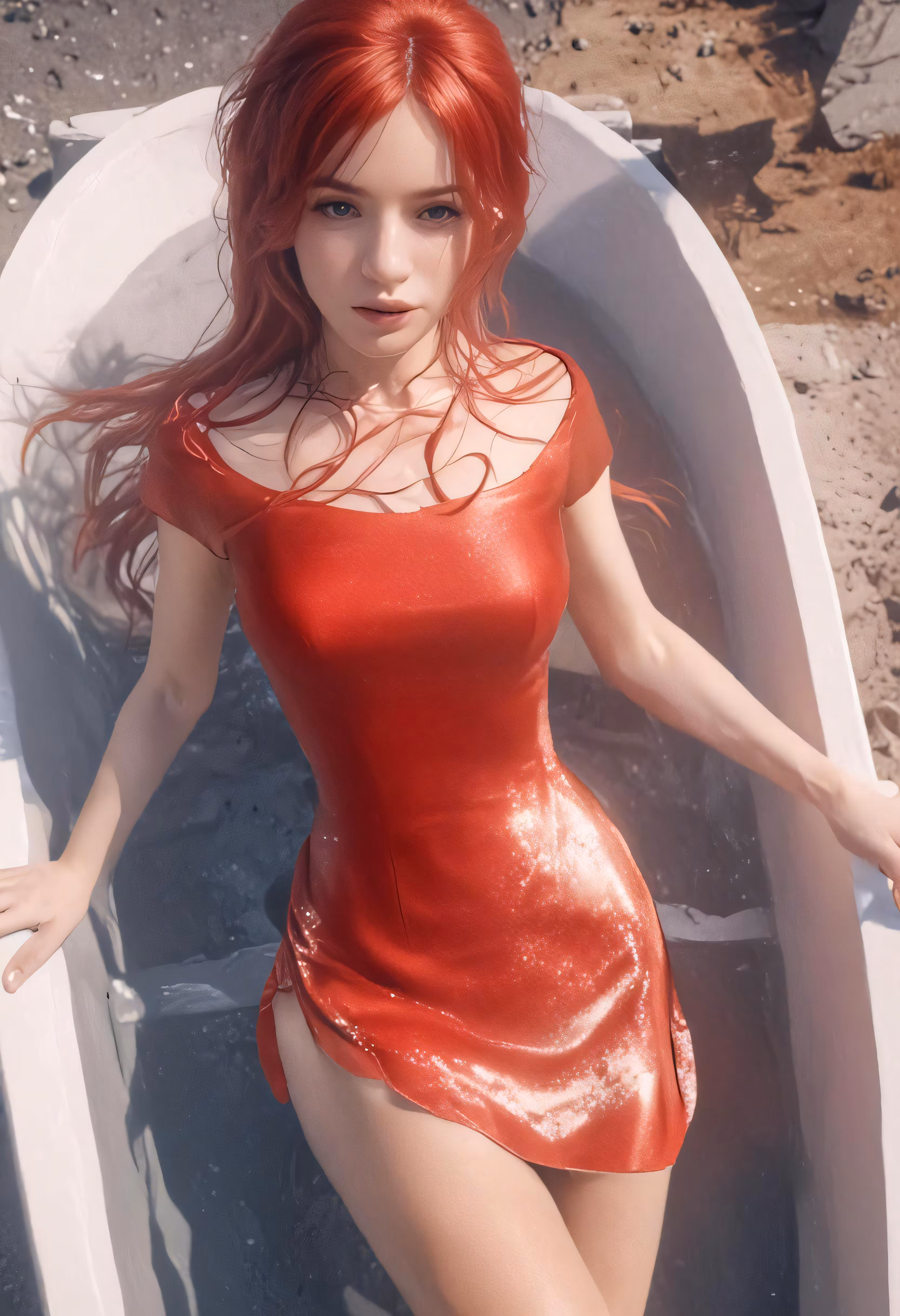 High resolution picture, free to use, a woman in a red dress sits in a boat