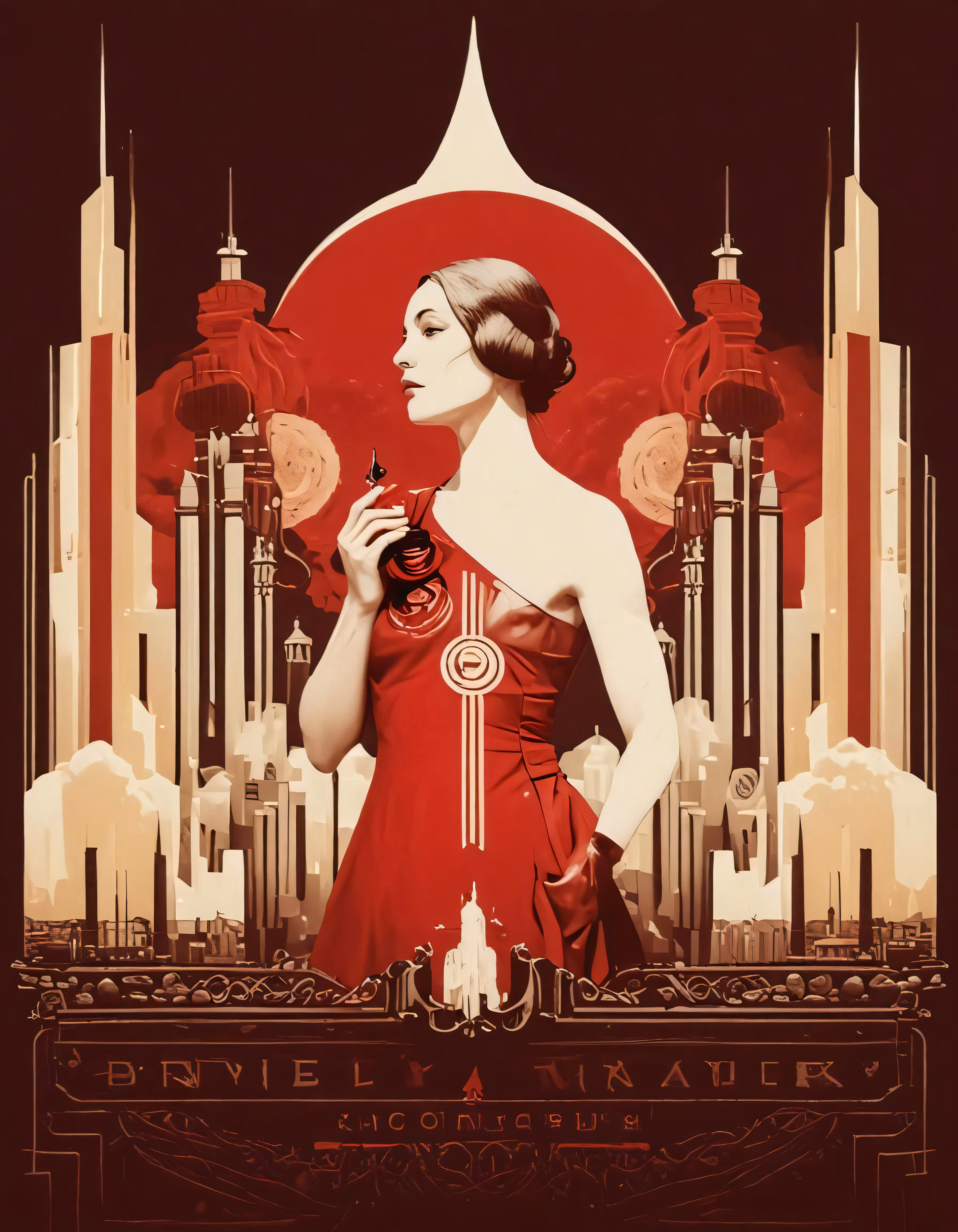 High resolution picture, free to use, a woman in a red dress standing next to buildings