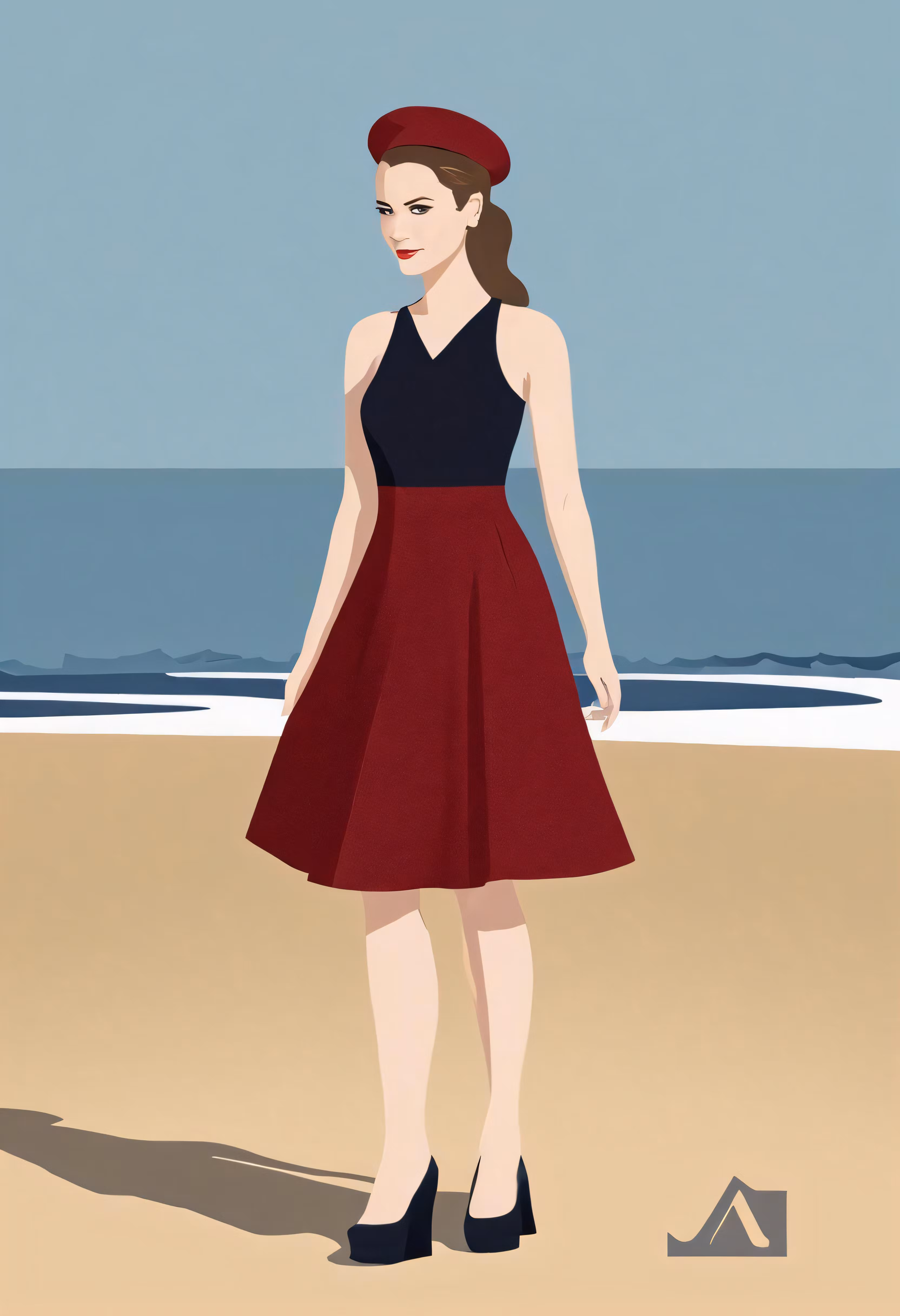 High resolution picture, free to use, a woman in a red skirt stands on a beach