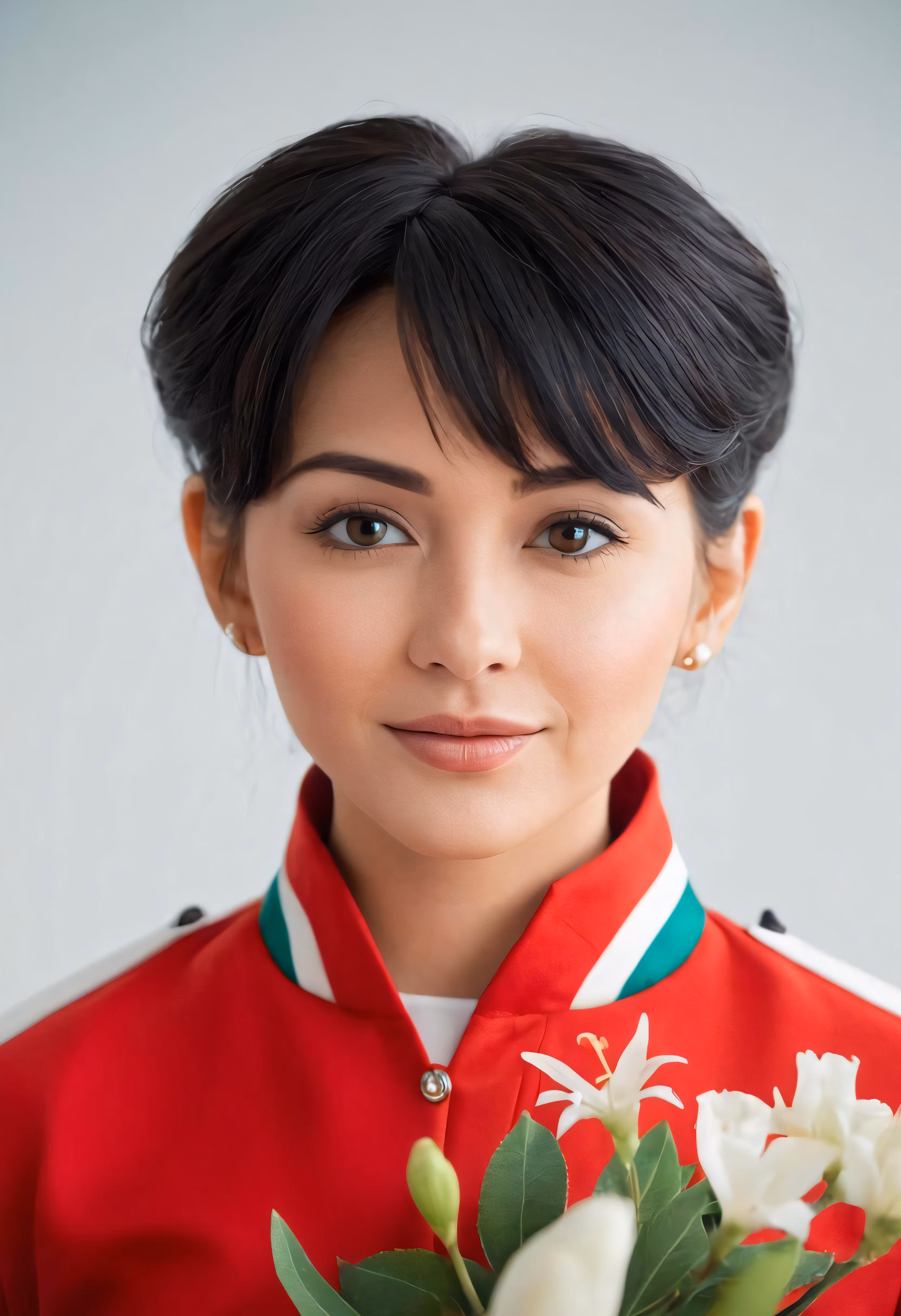 High resolution picture, free to use, a woman in a red uniform holding flowers