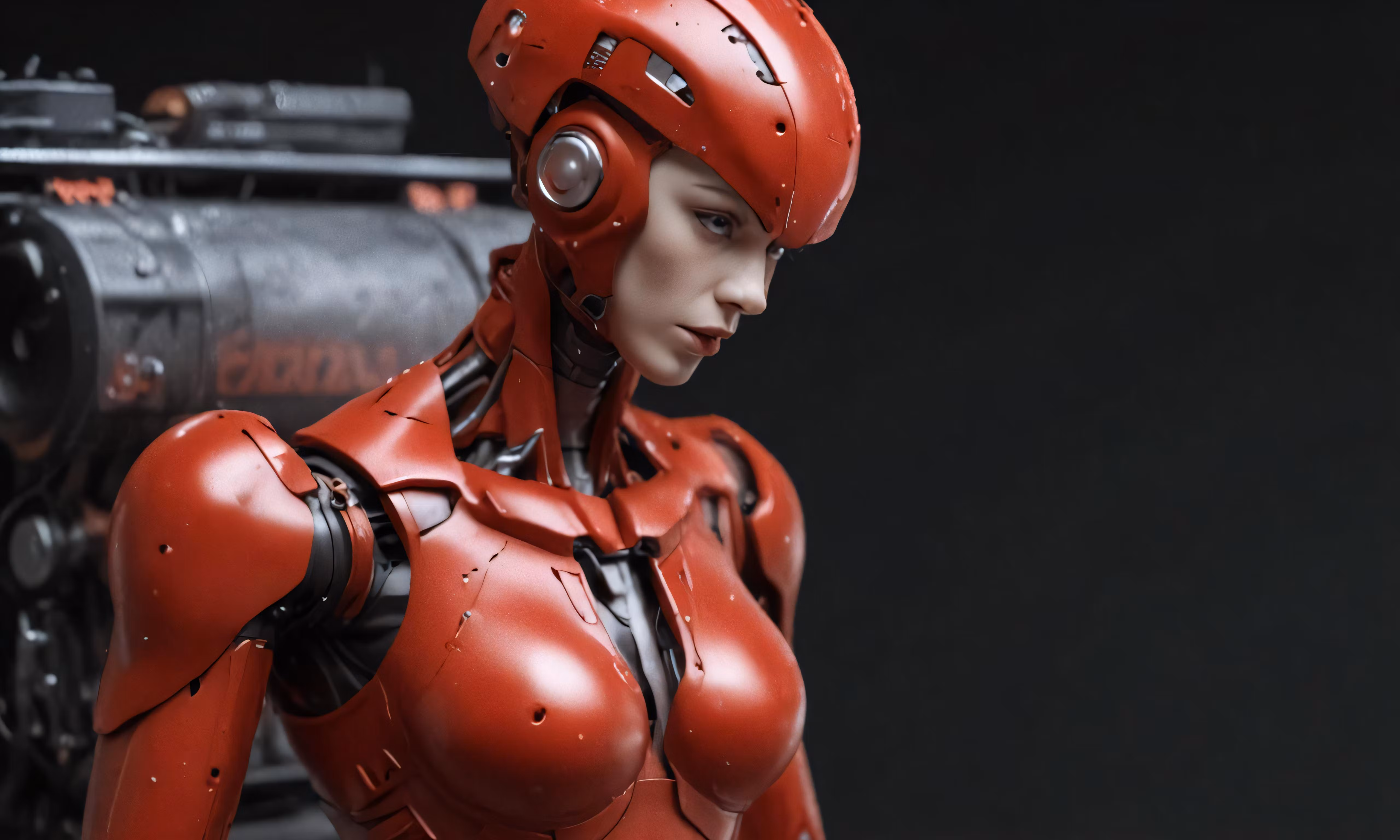High resolution picture, free to use, a woman in a robot suit standing next to a cannon