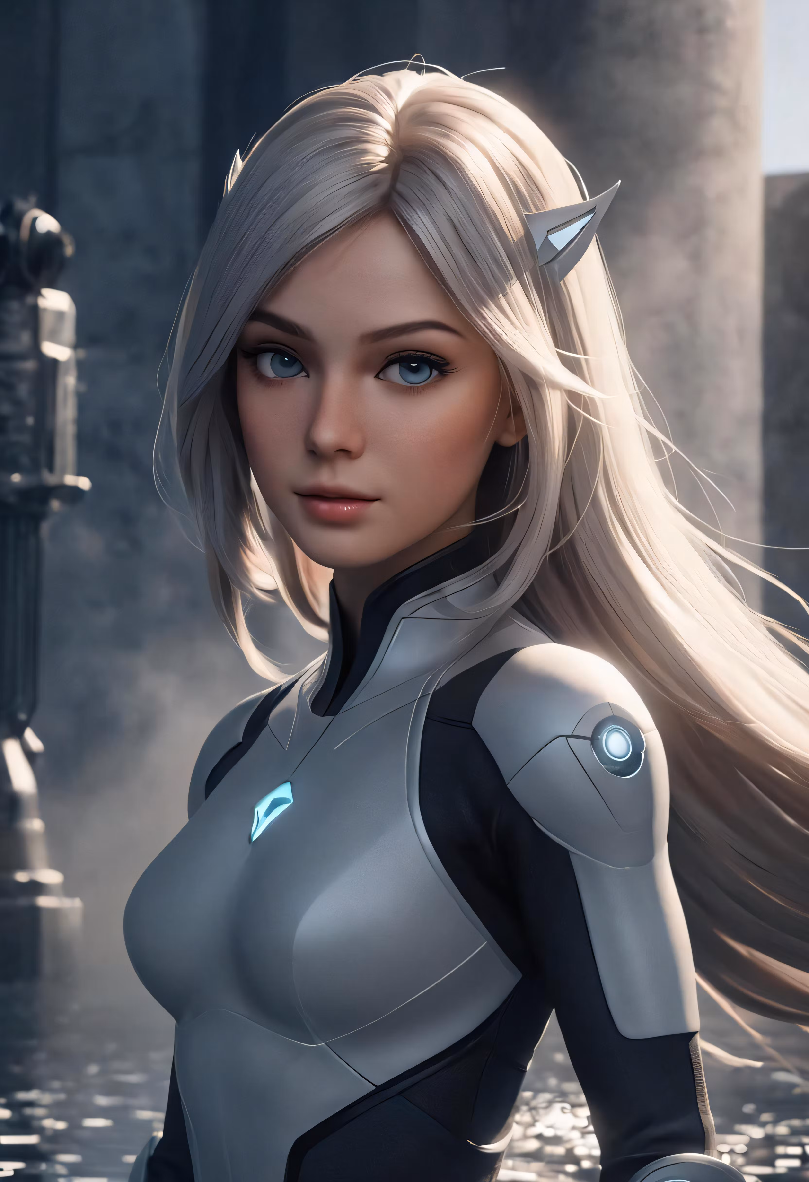 High resolution picture, free to use, a woman in a silver and black suit next to water