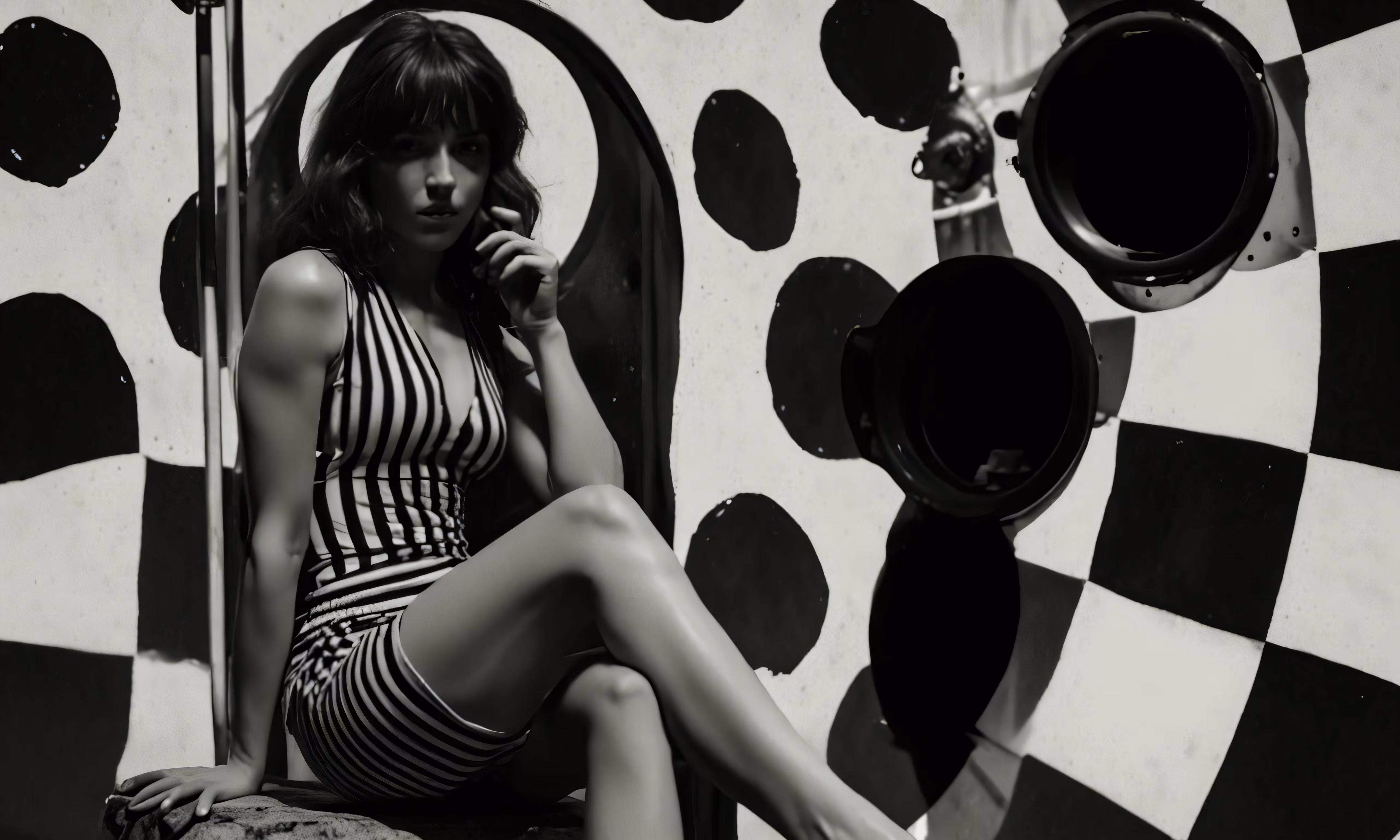 High resolution picture, free to use, a woman in a striped bathing suit with polka dot pattern