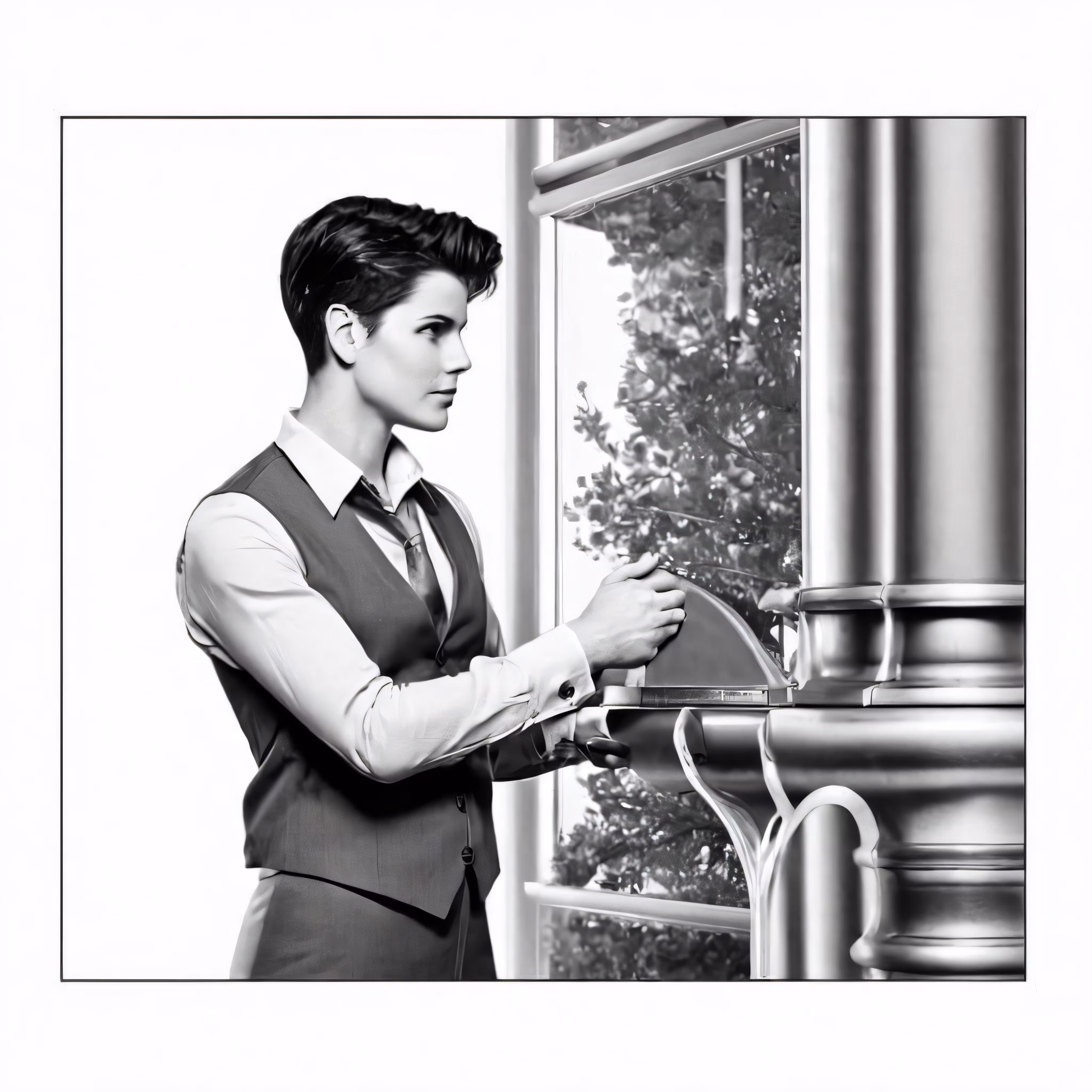 High resolution picture, free to use, a woman in a suit stands next to a window
