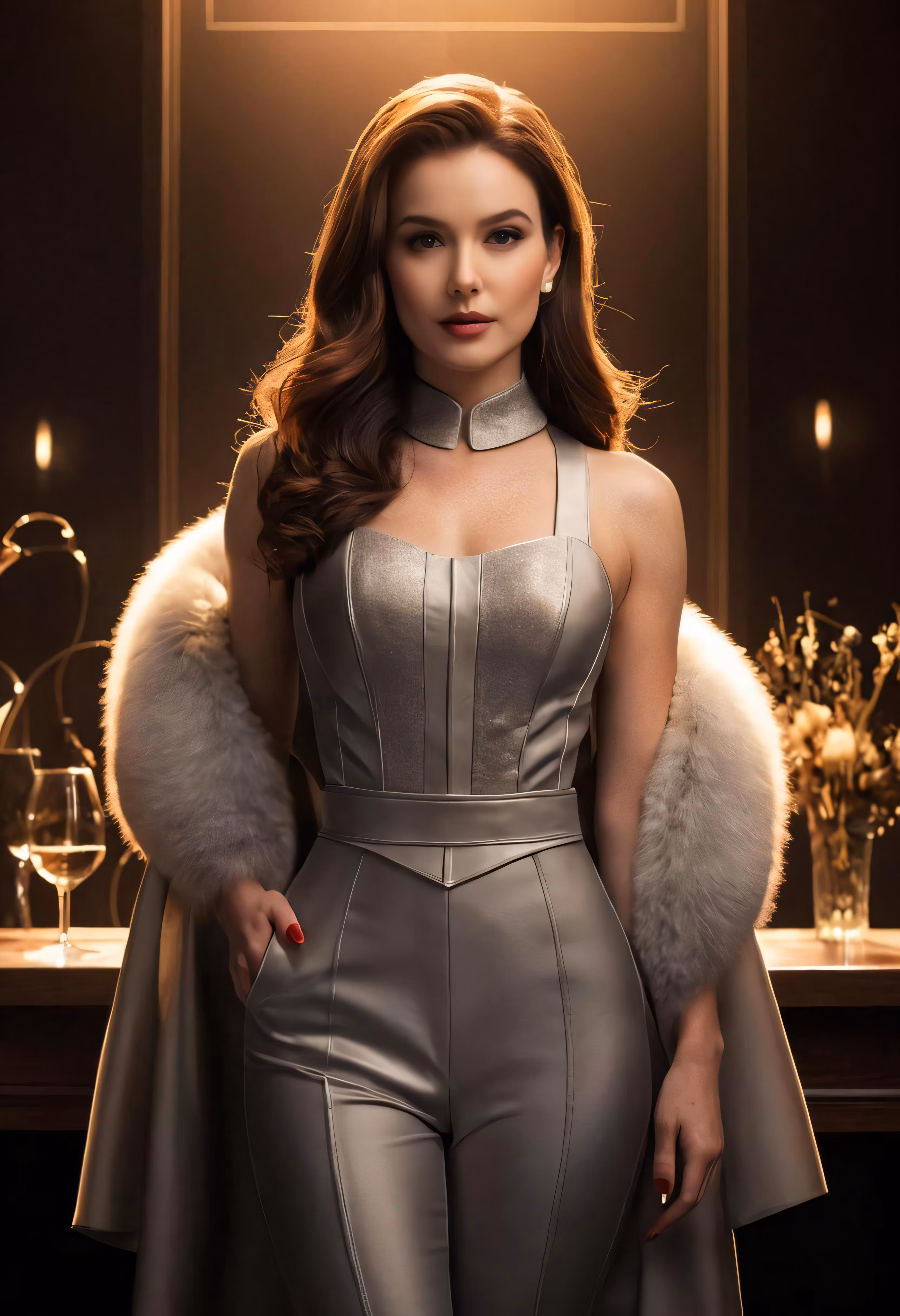High resolution picture, free to use, a woman in a suit with fur collar, and silver pants