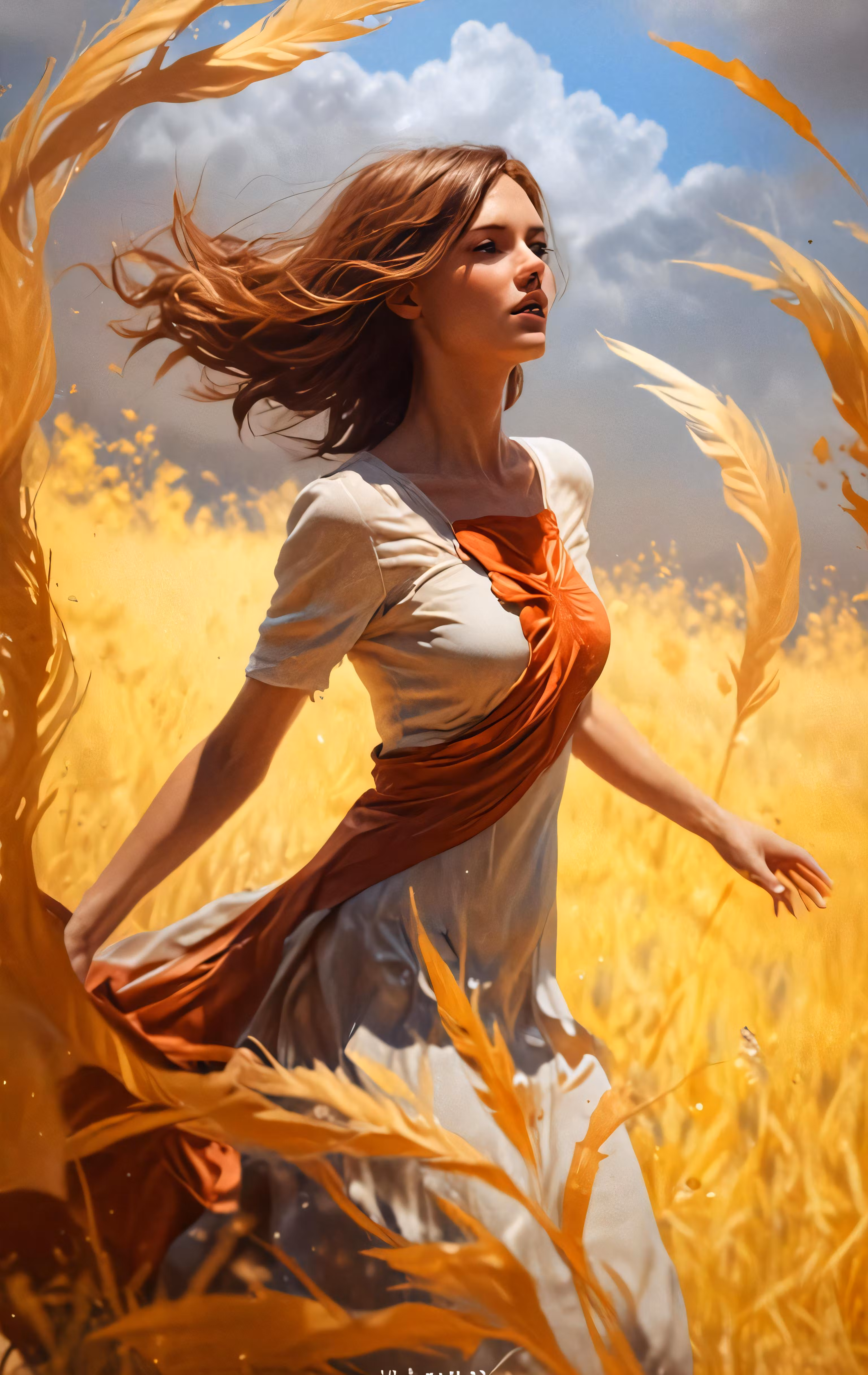 High resolution picture, free to use, a woman in a white dress and brown scarf stands in tall grass
