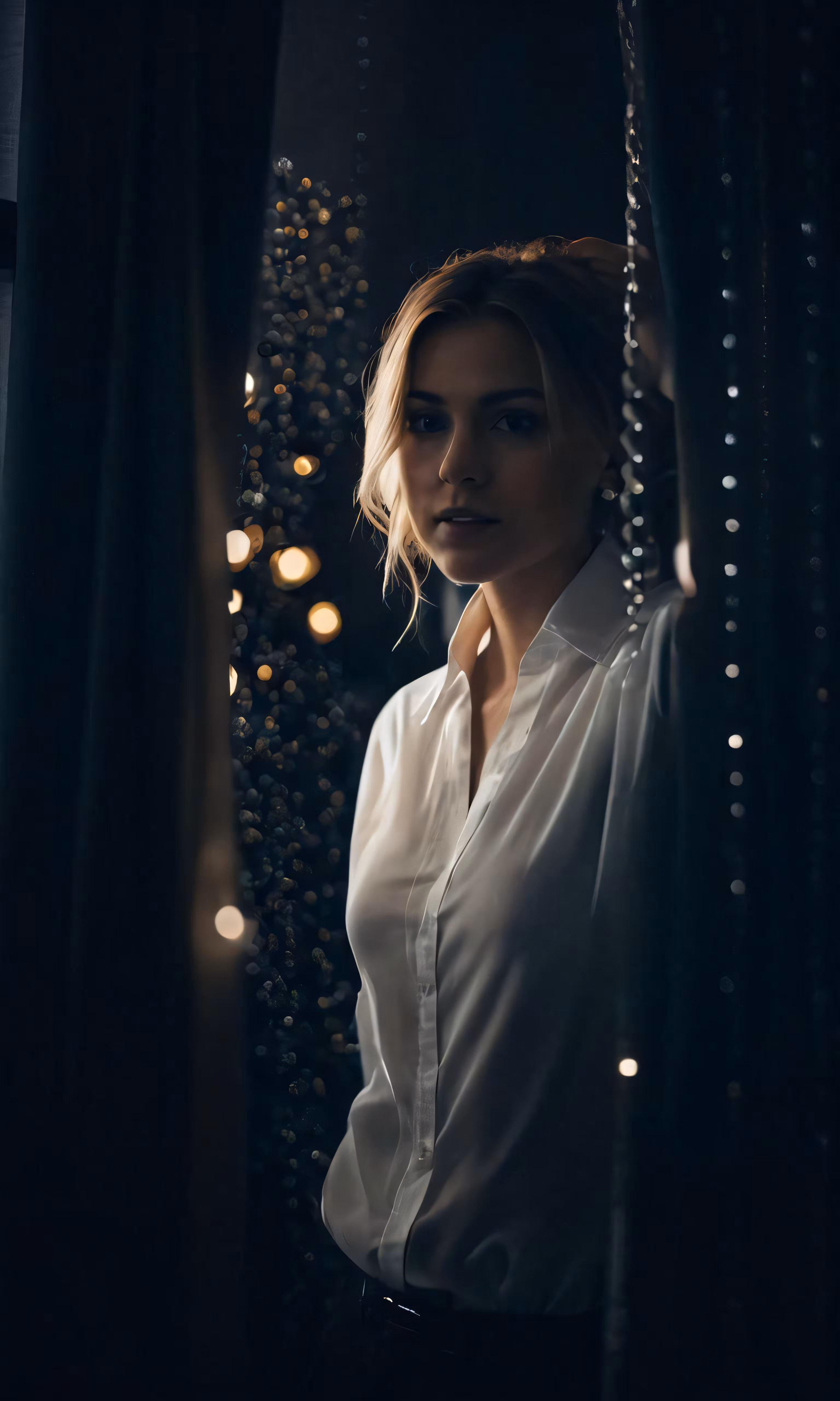 High resolution picture, free to use, a woman in a white shirt looks out the window