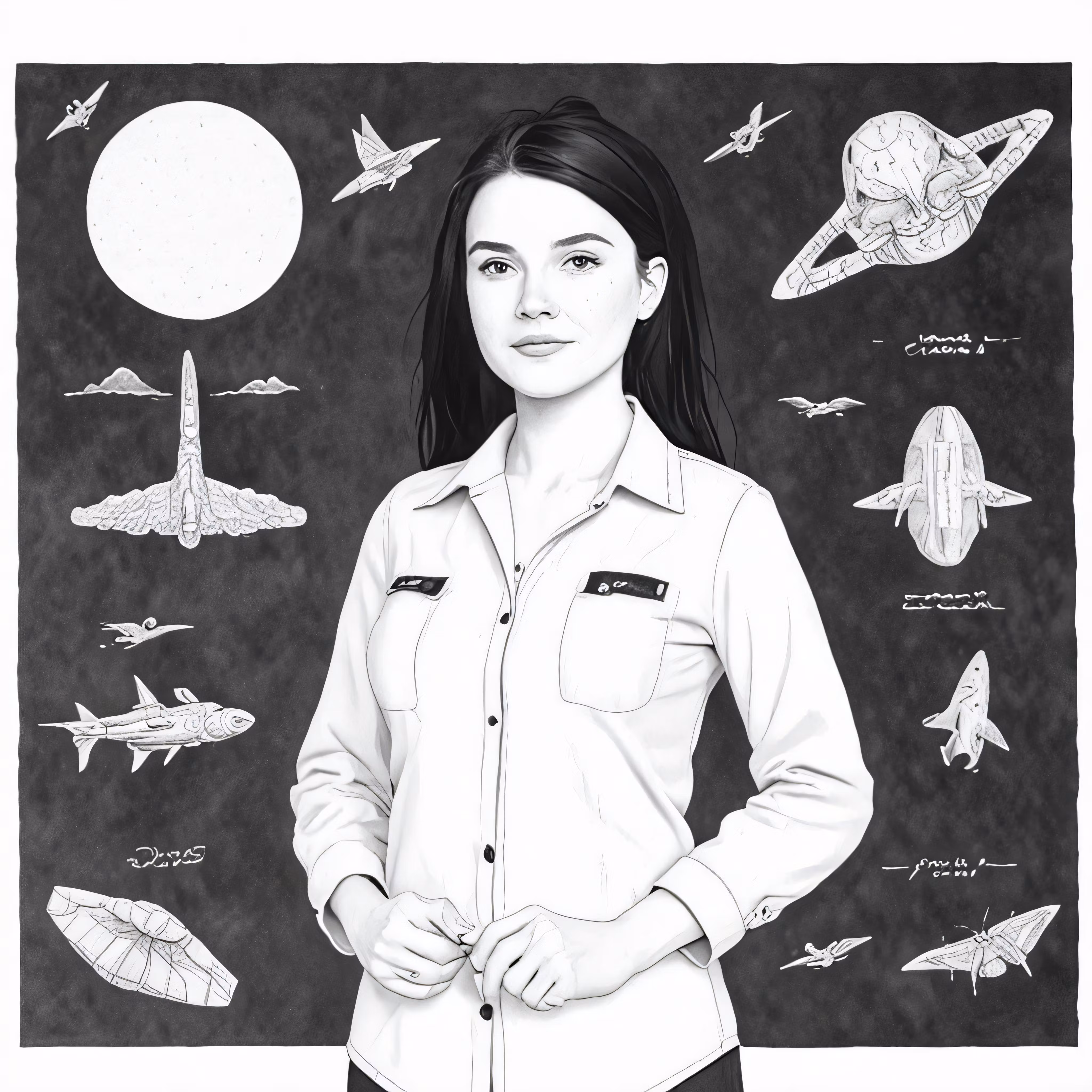 High resolution picture, free to use, a woman in a white shirt standing in front of an illustration