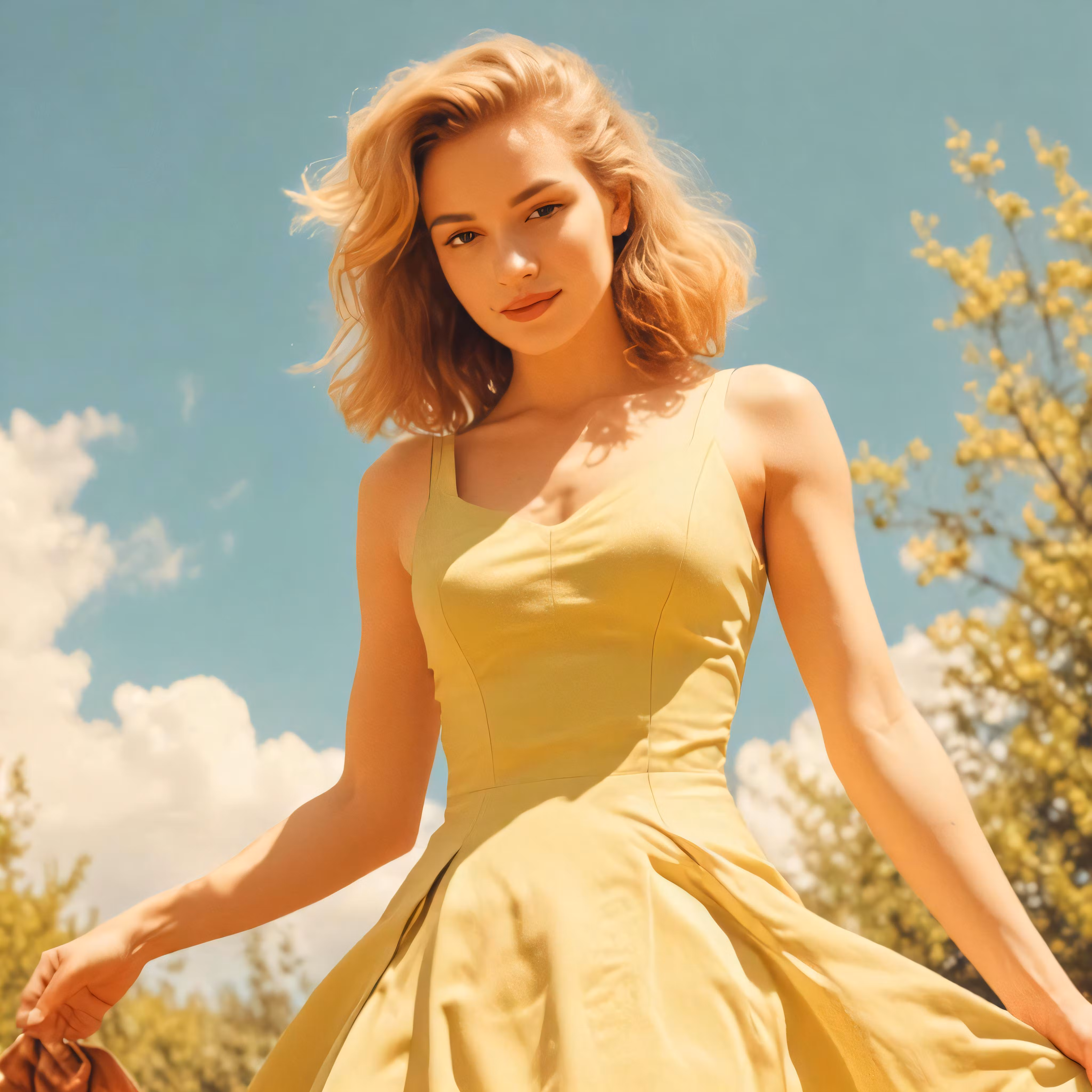 High resolution picture, free to use, a woman in a yellow dress, in the shade