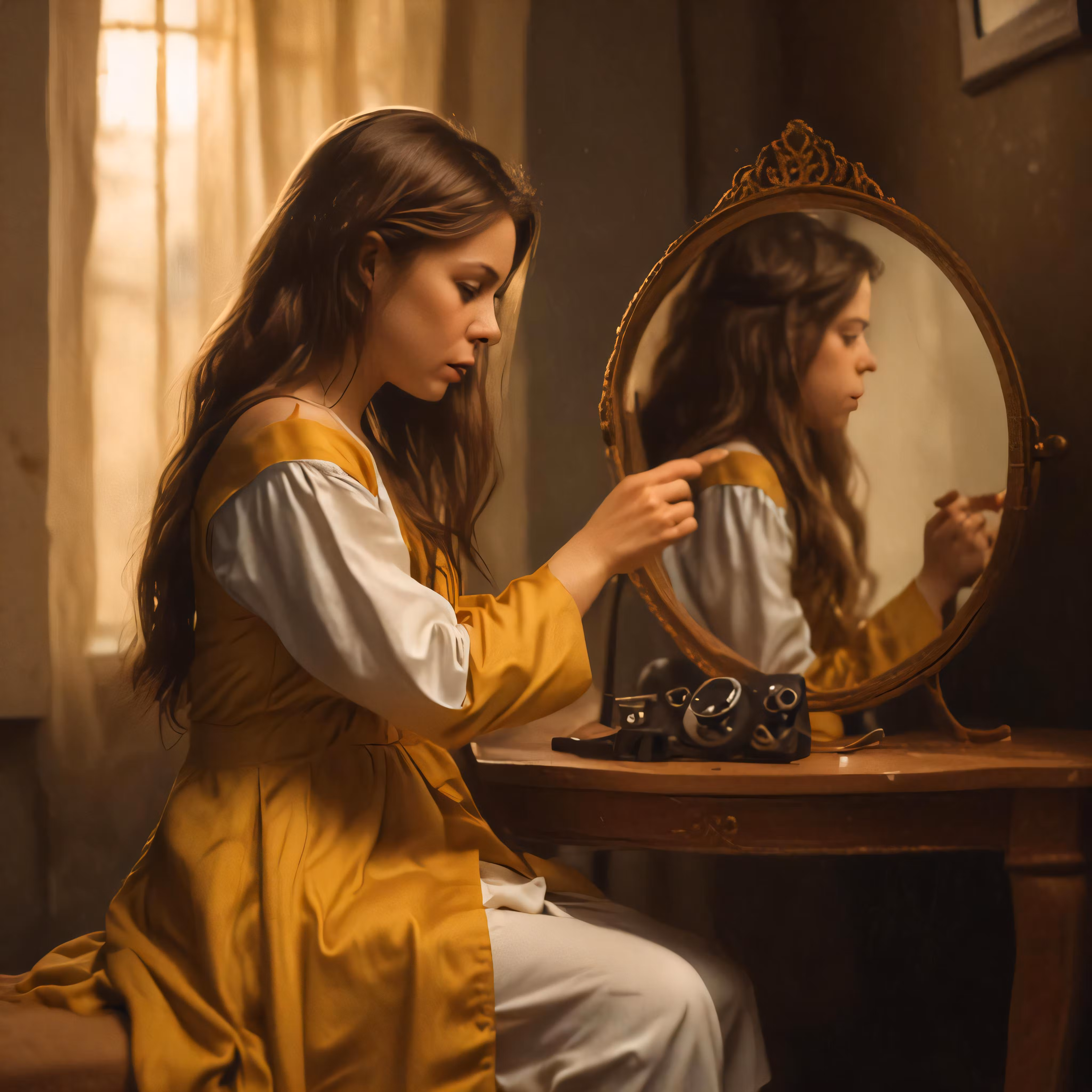 High resolution picture, free to use, a woman in a yellow dress combing her long hair