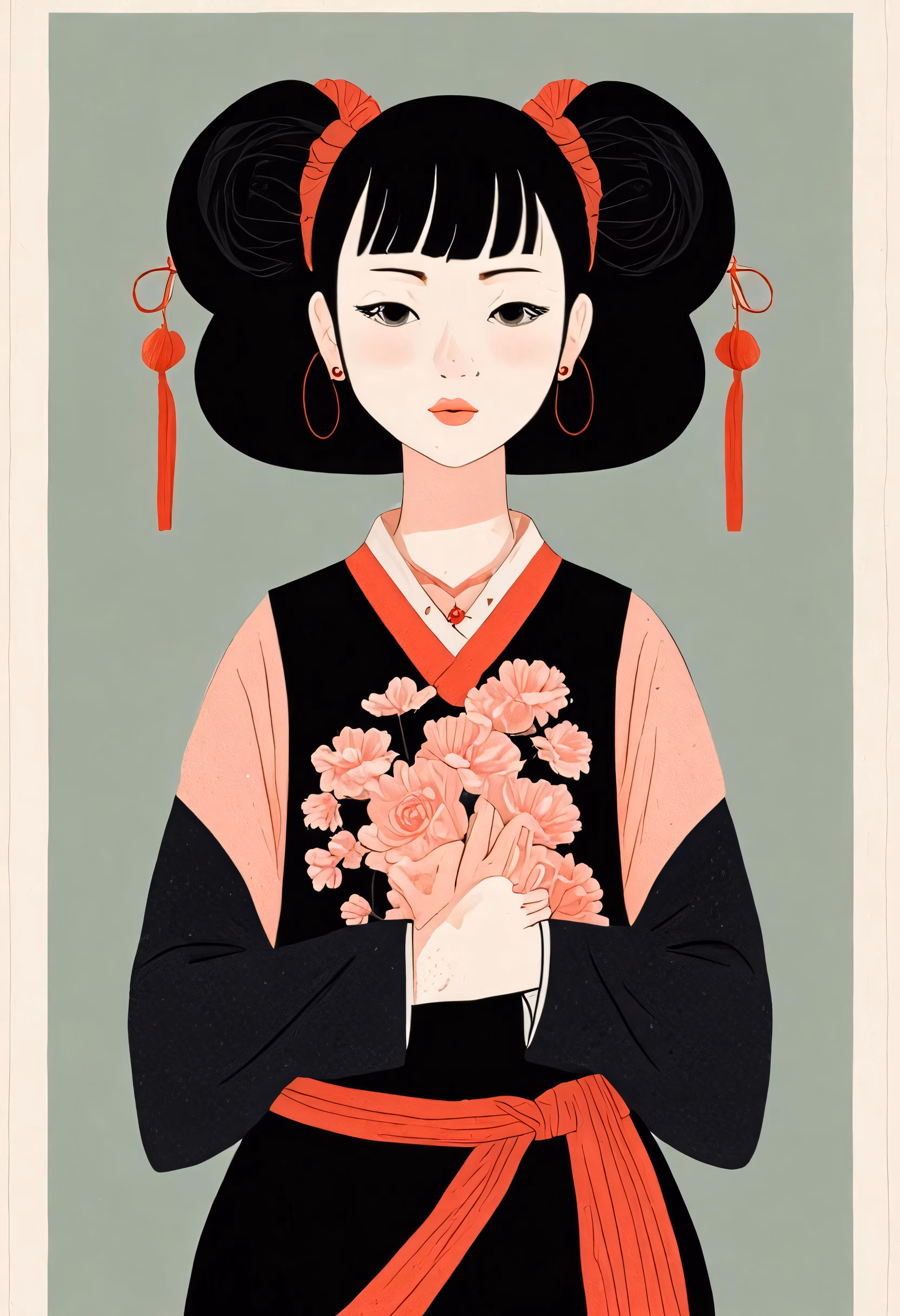 High resolution picture, free to use, a woman in an asian kimono holding flowers