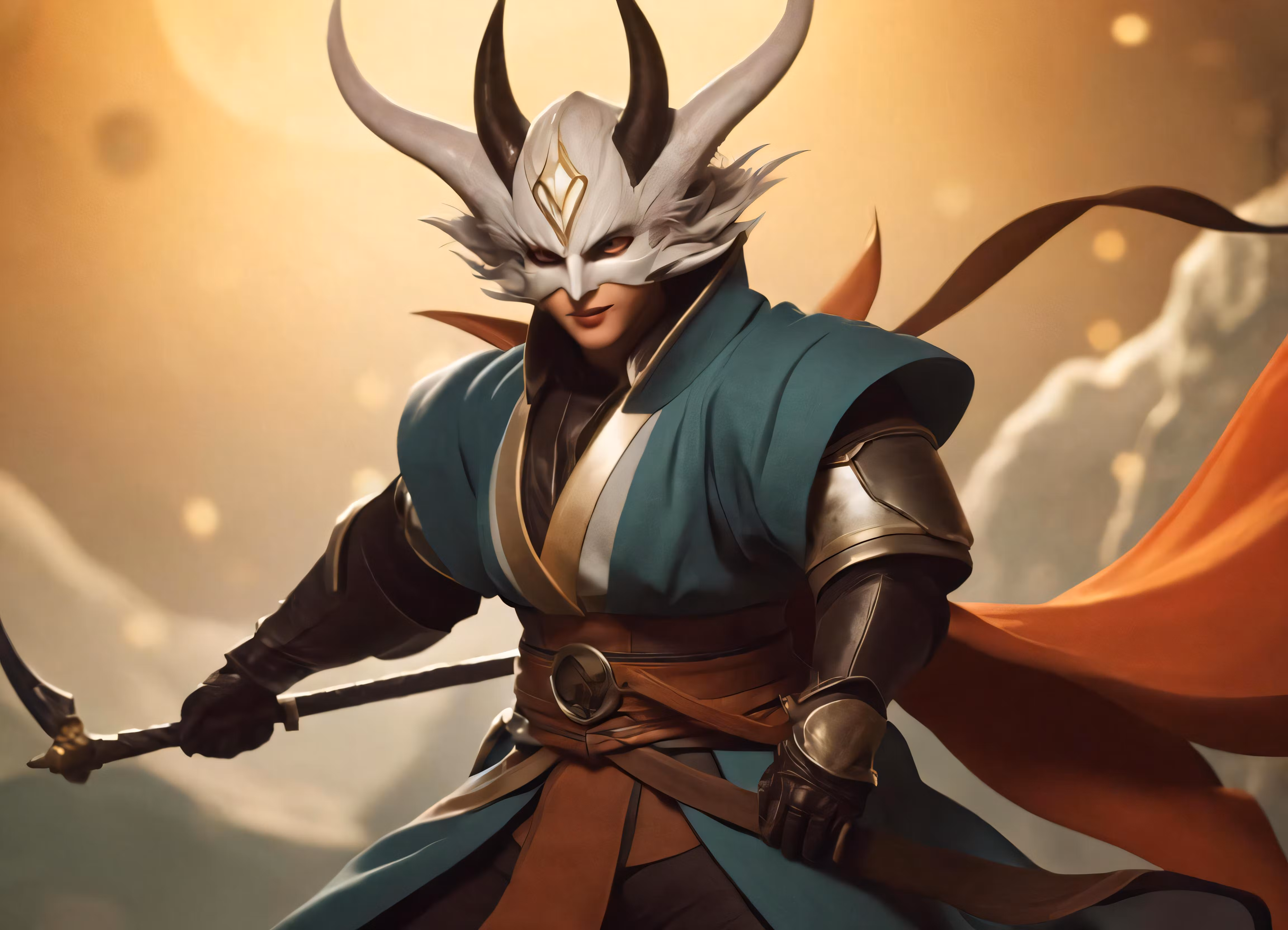 High resolution picture, free to use, a woman in an avatar holding a sword and wearing a horned face