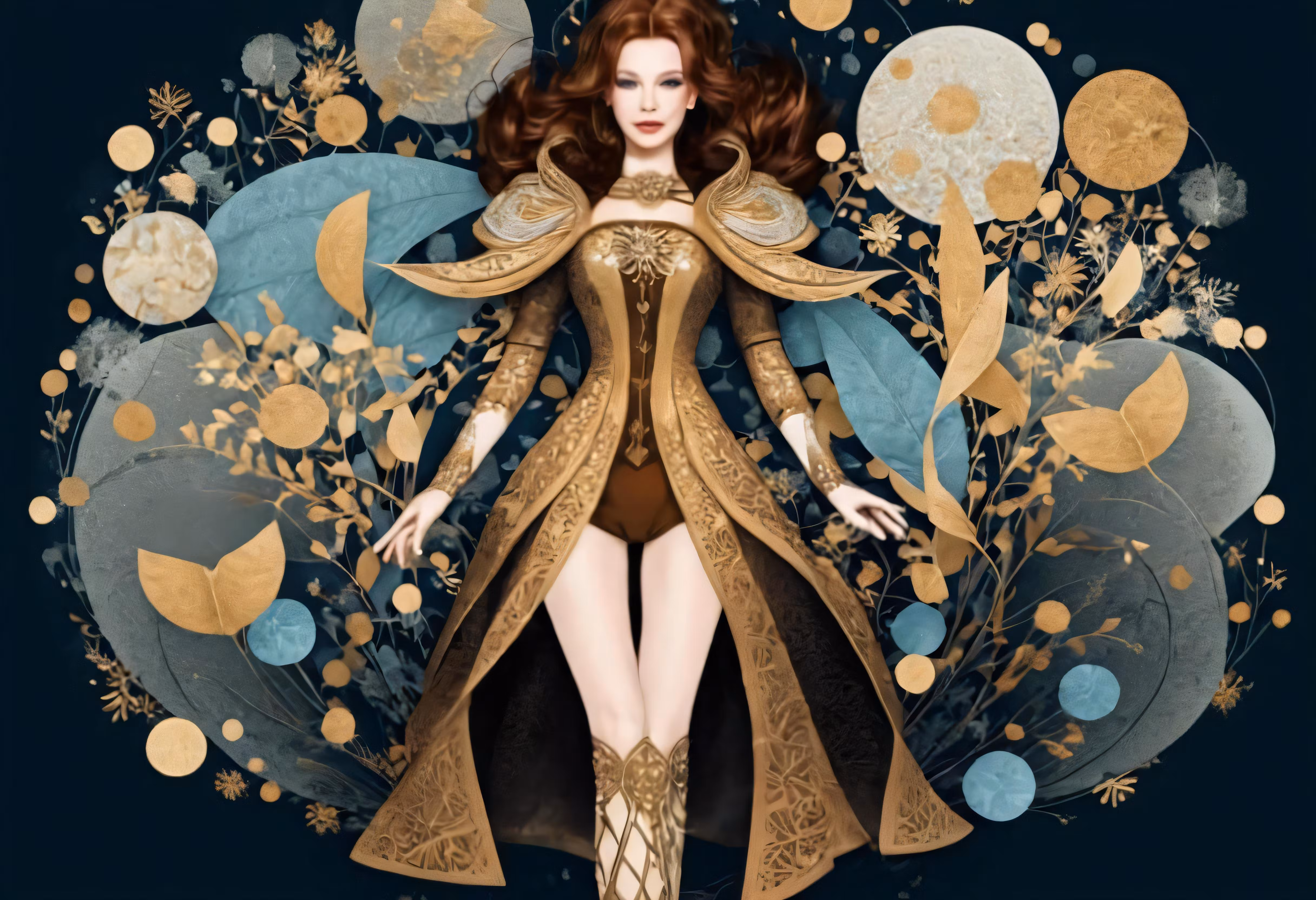 High resolution picture, free to use, a woman in an intricate gold and black outfit