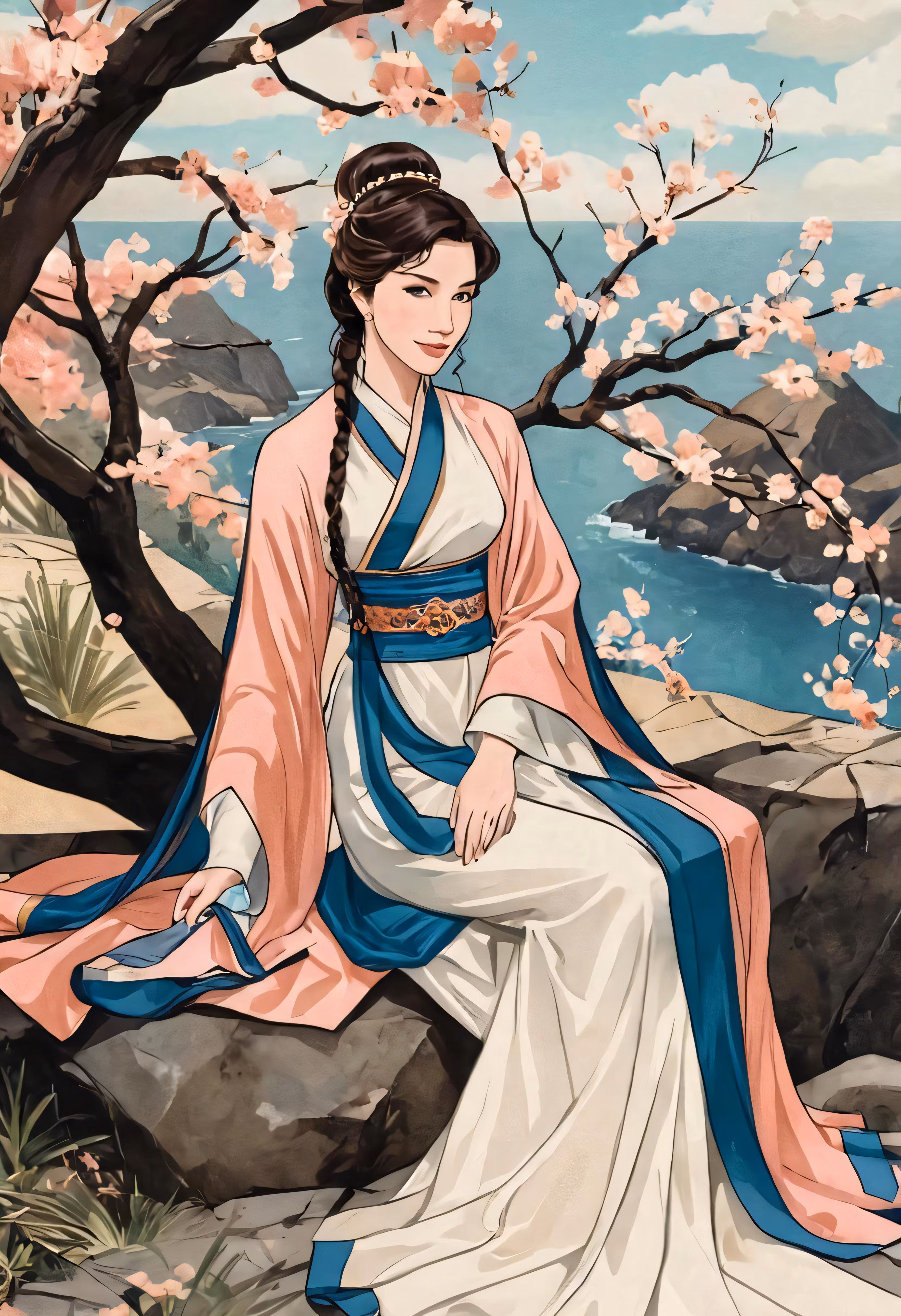 High resolution picture, free to use, a woman in an oriental dress is sitting on the rocks