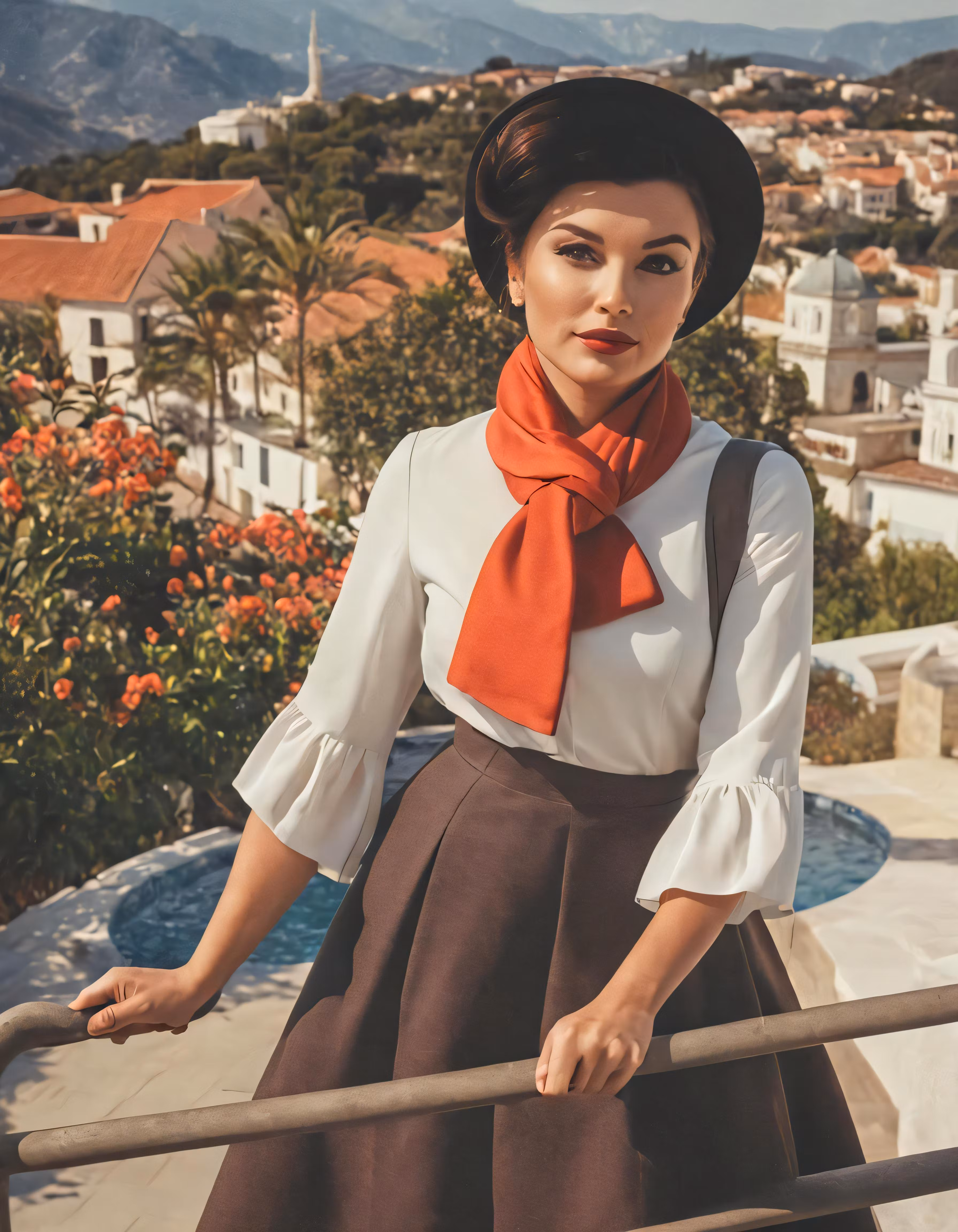 High resolution picture, free to use, a woman in an outfit holding a bar in front of a beautiful view