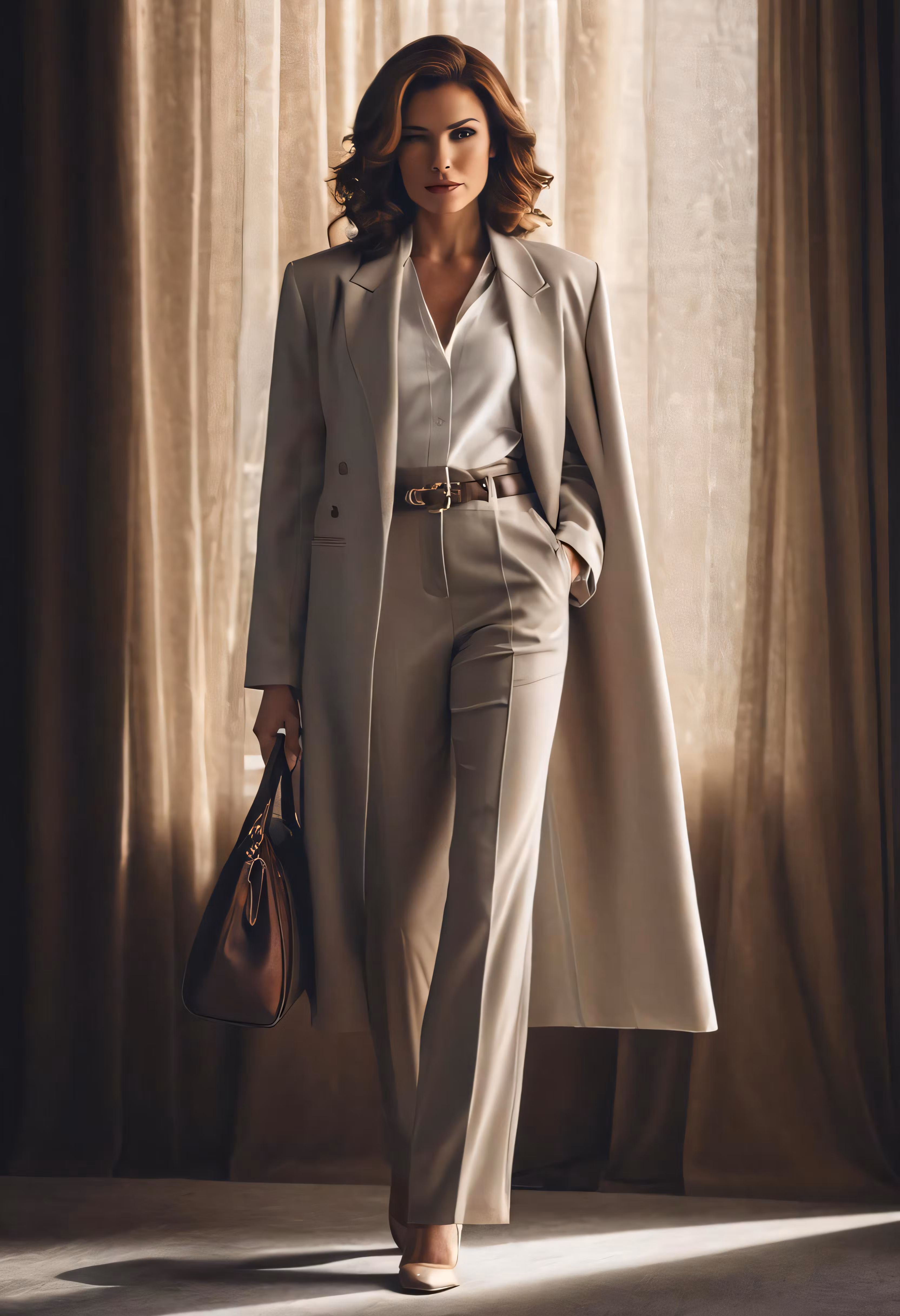 High resolution picture, free to use, a woman in an overcoat and pants walks in front of curtains