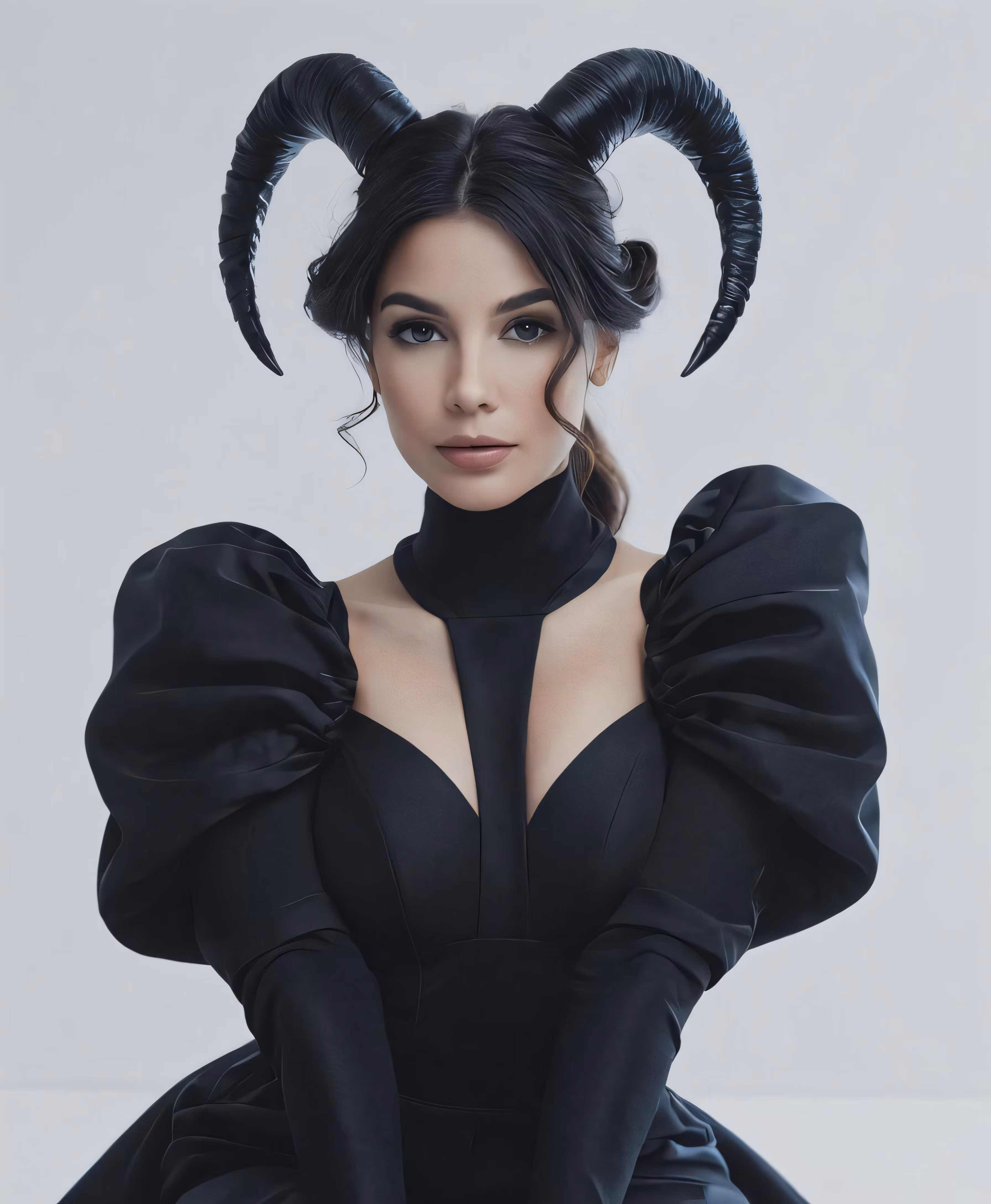 High resolution picture, free to use, a woman in black dress and horns posing for a picture