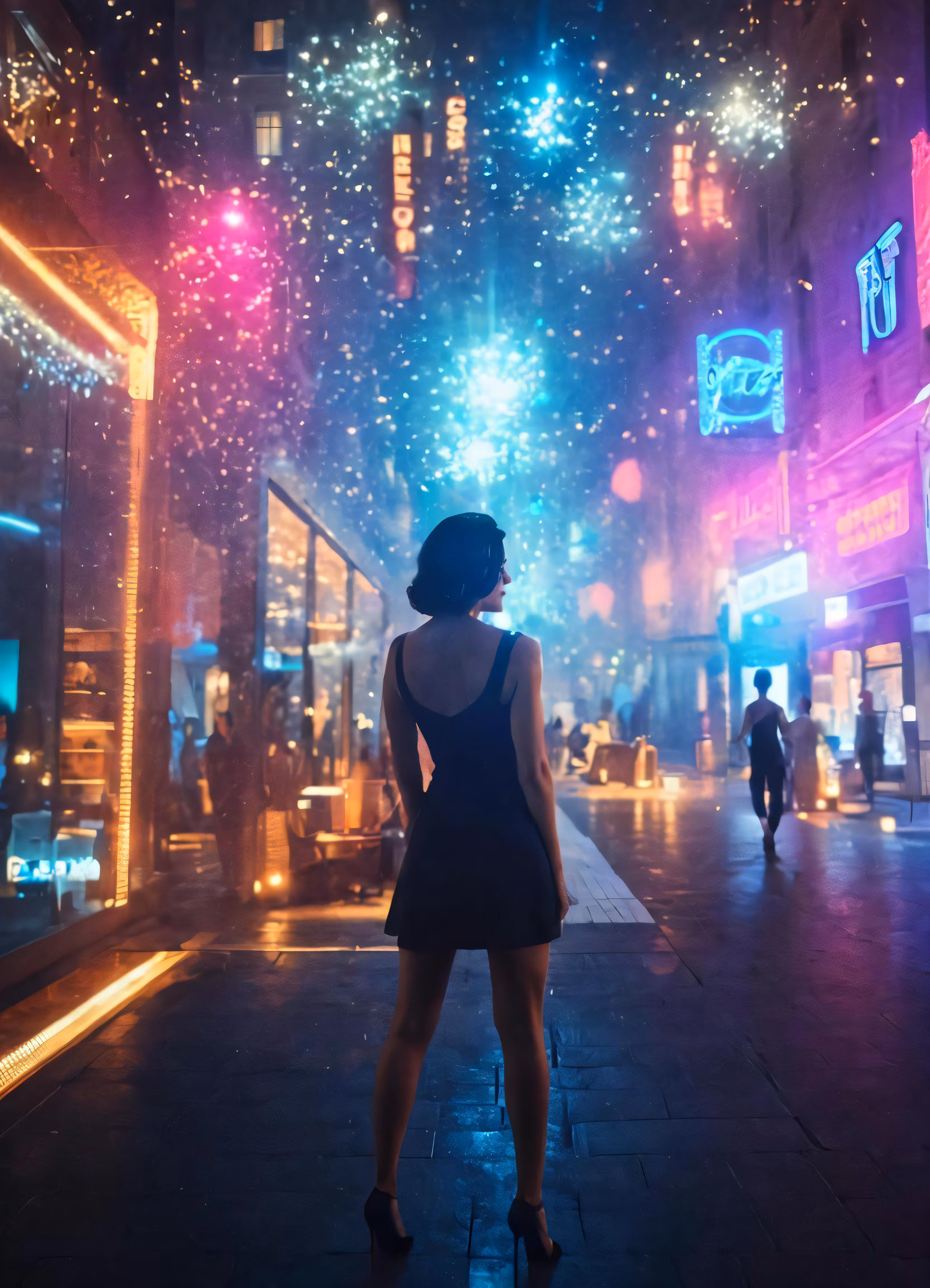 High resolution picture, free to use, a woman in black dress looking at fireworks