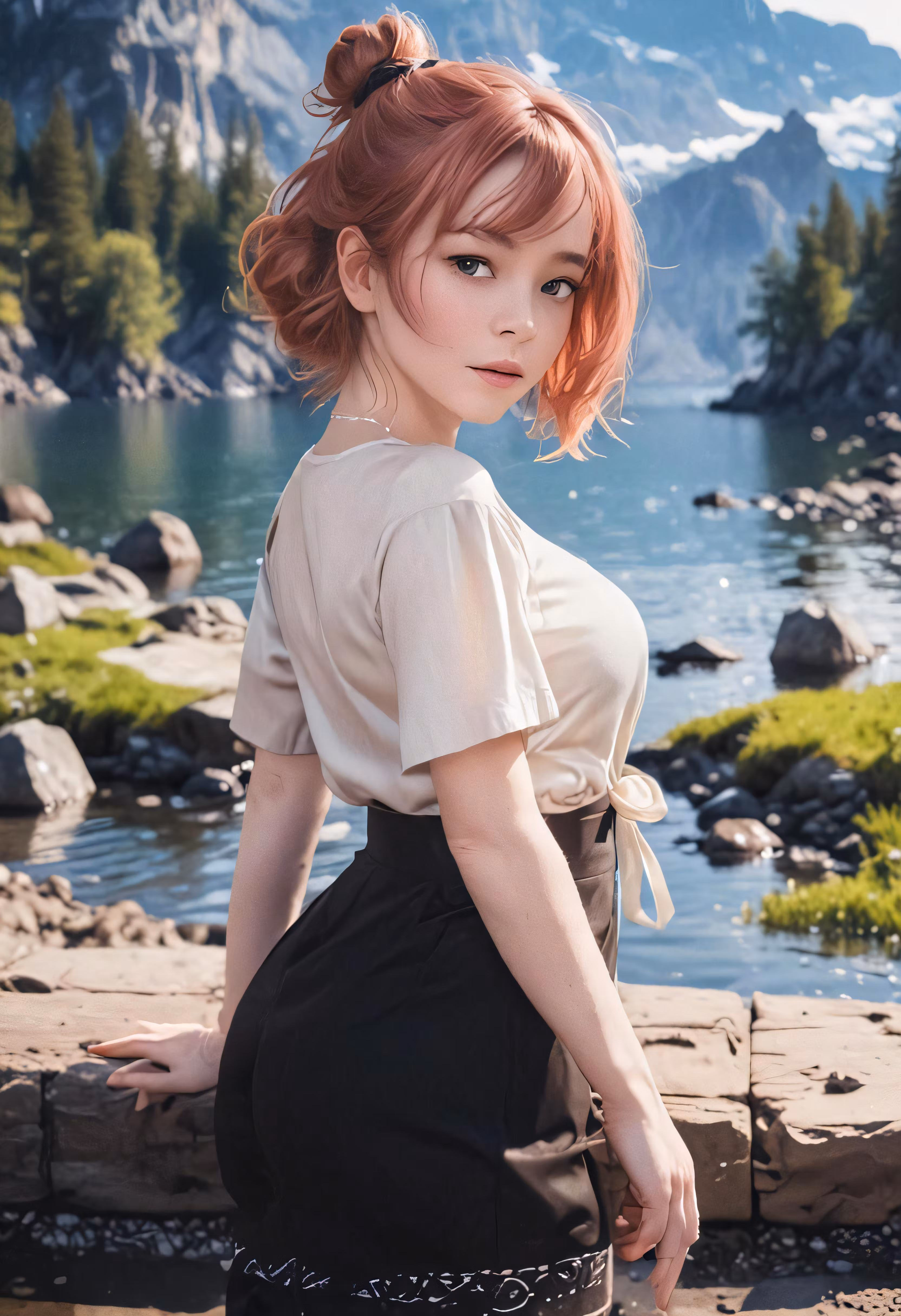 High resolution picture, free to use, a woman in black dress standing near a mountain lake