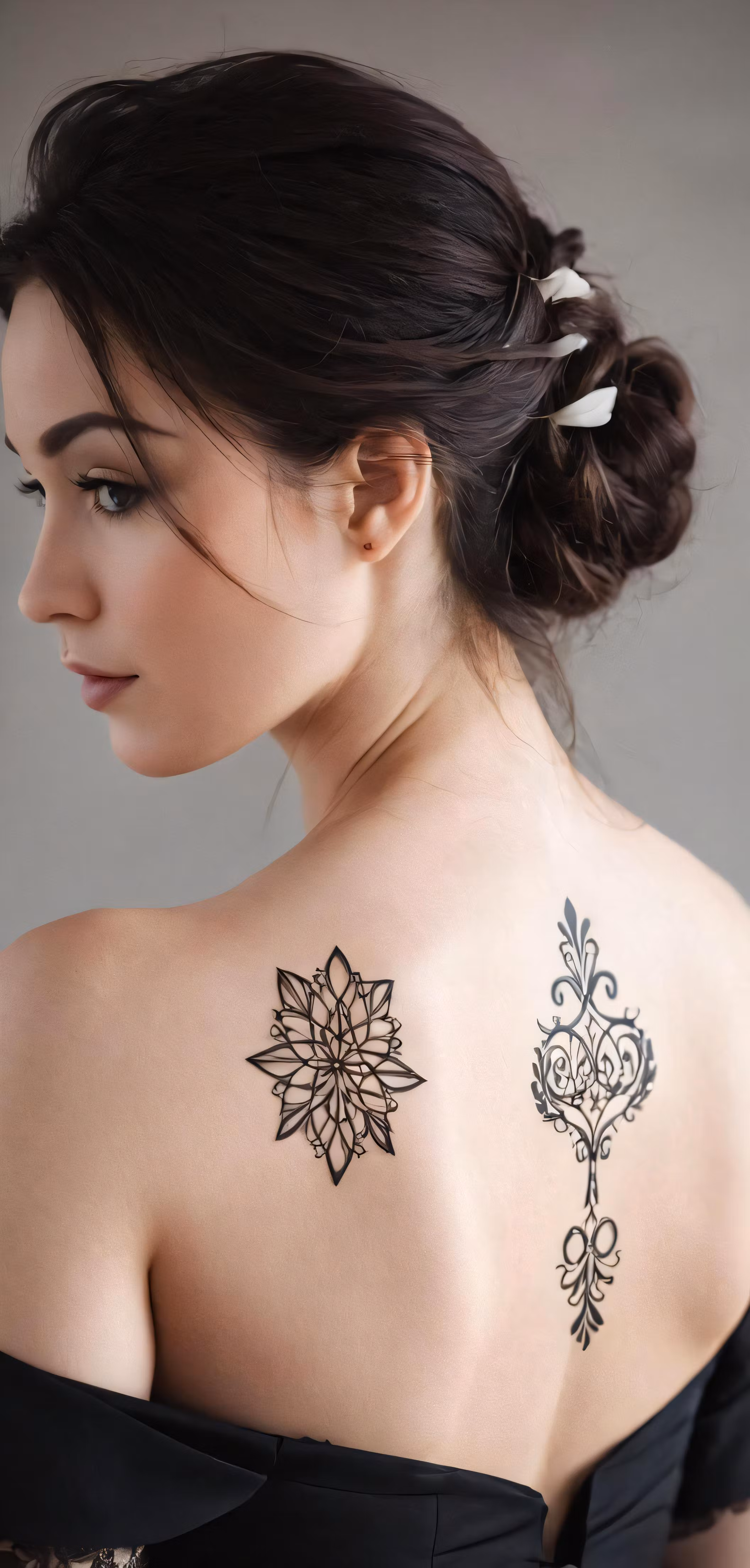 High resolution picture, free to use, a woman in black is with a beautiful tattoo