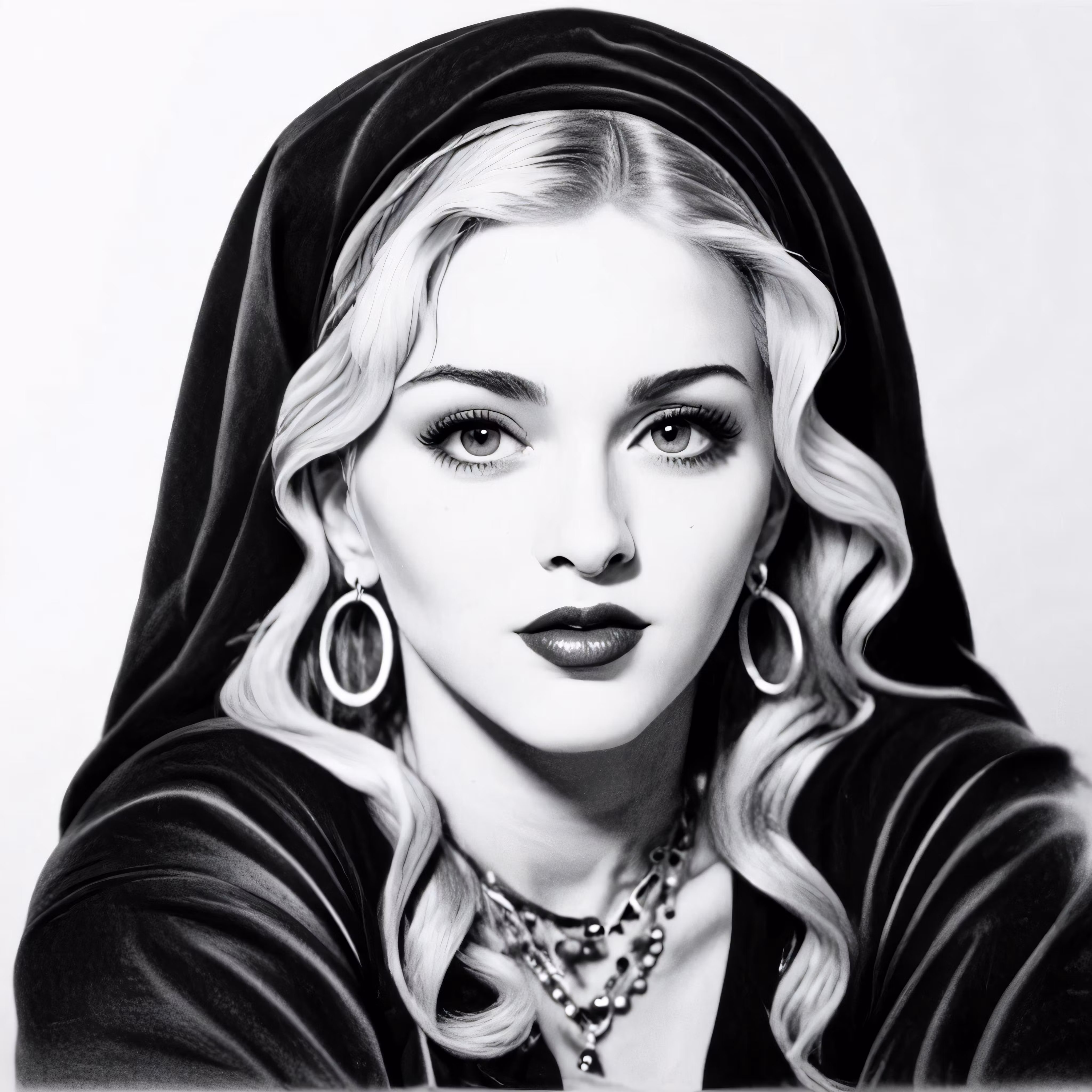 High resolution picture, free to use, a woman in black outfit with large hoop earrings