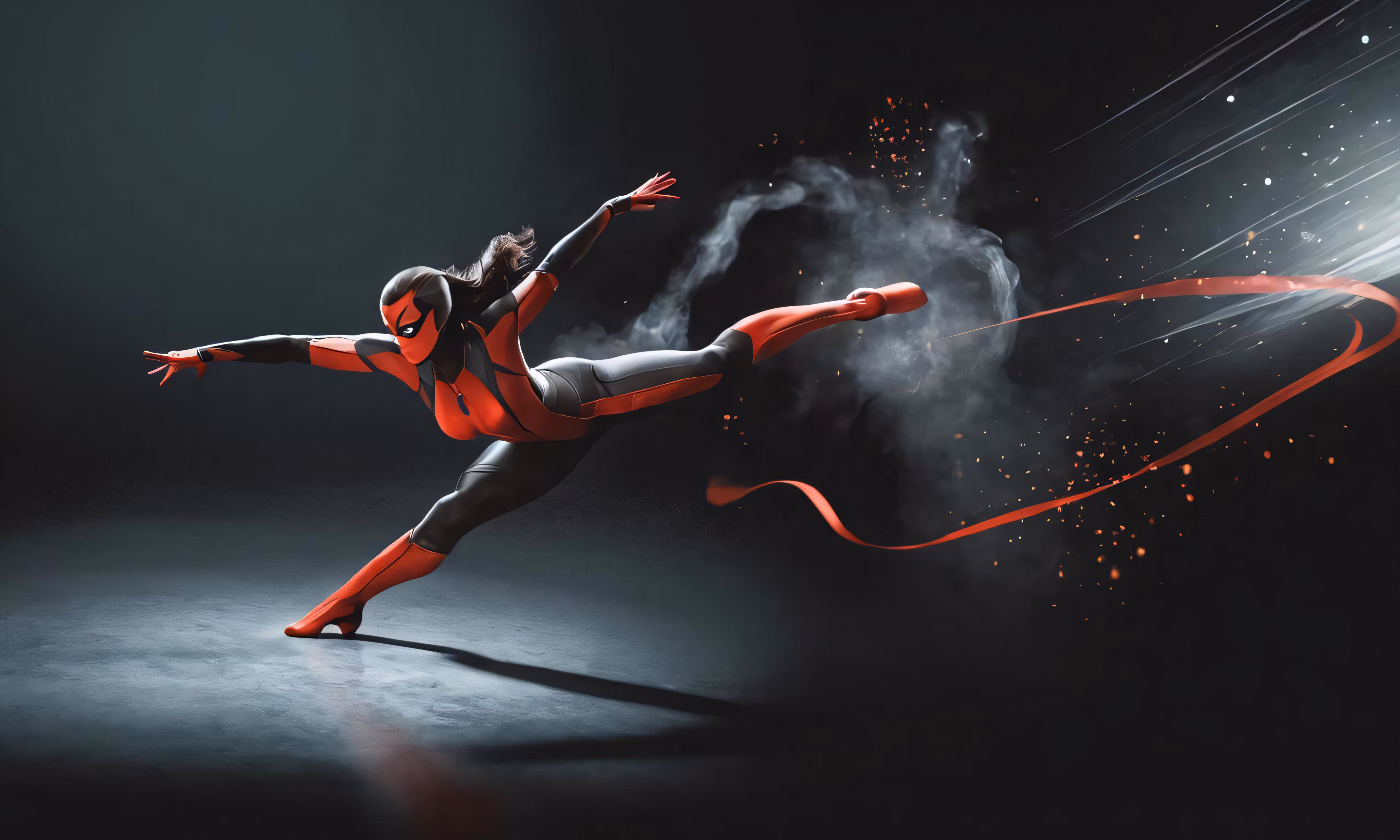High resolution picture, free to use, a woman in costume leaping with the help of a long red ribbon