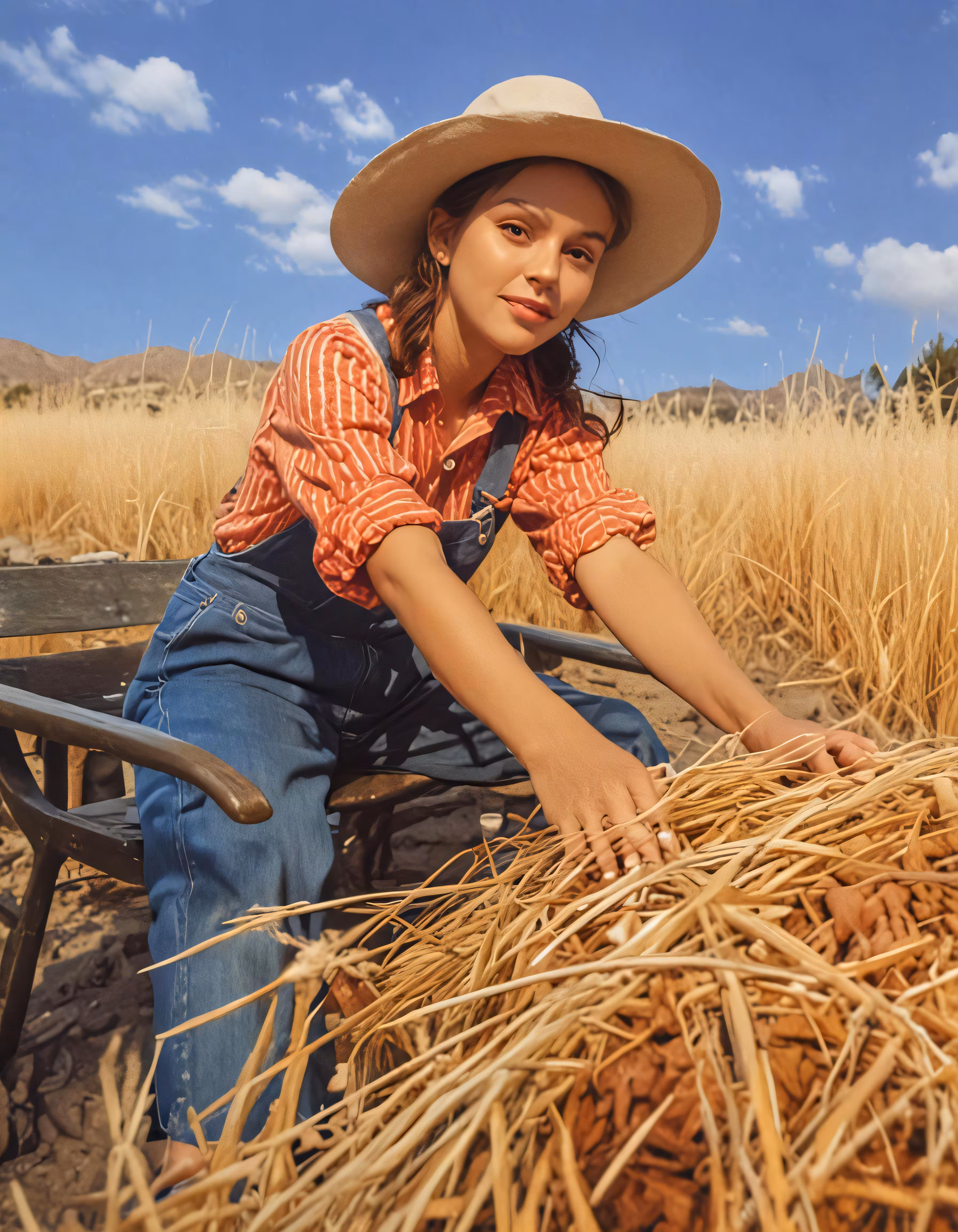 High resolution picture, free to use, a woman in cowboy clothes leaning against hay next to a bed of straw