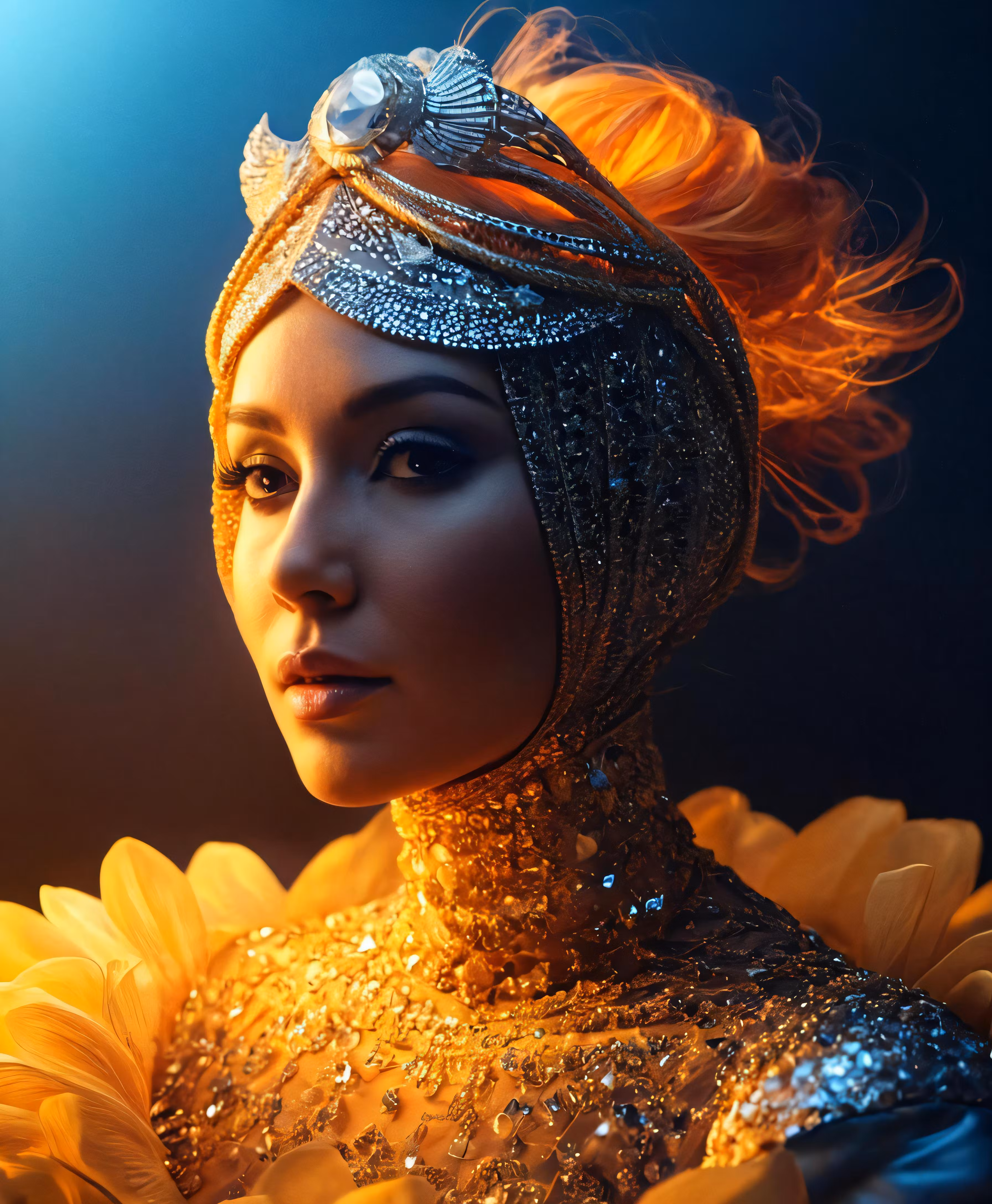 High resolution picture, free to use, a woman in gold, hair in a head wrap and a very large pearled head piece