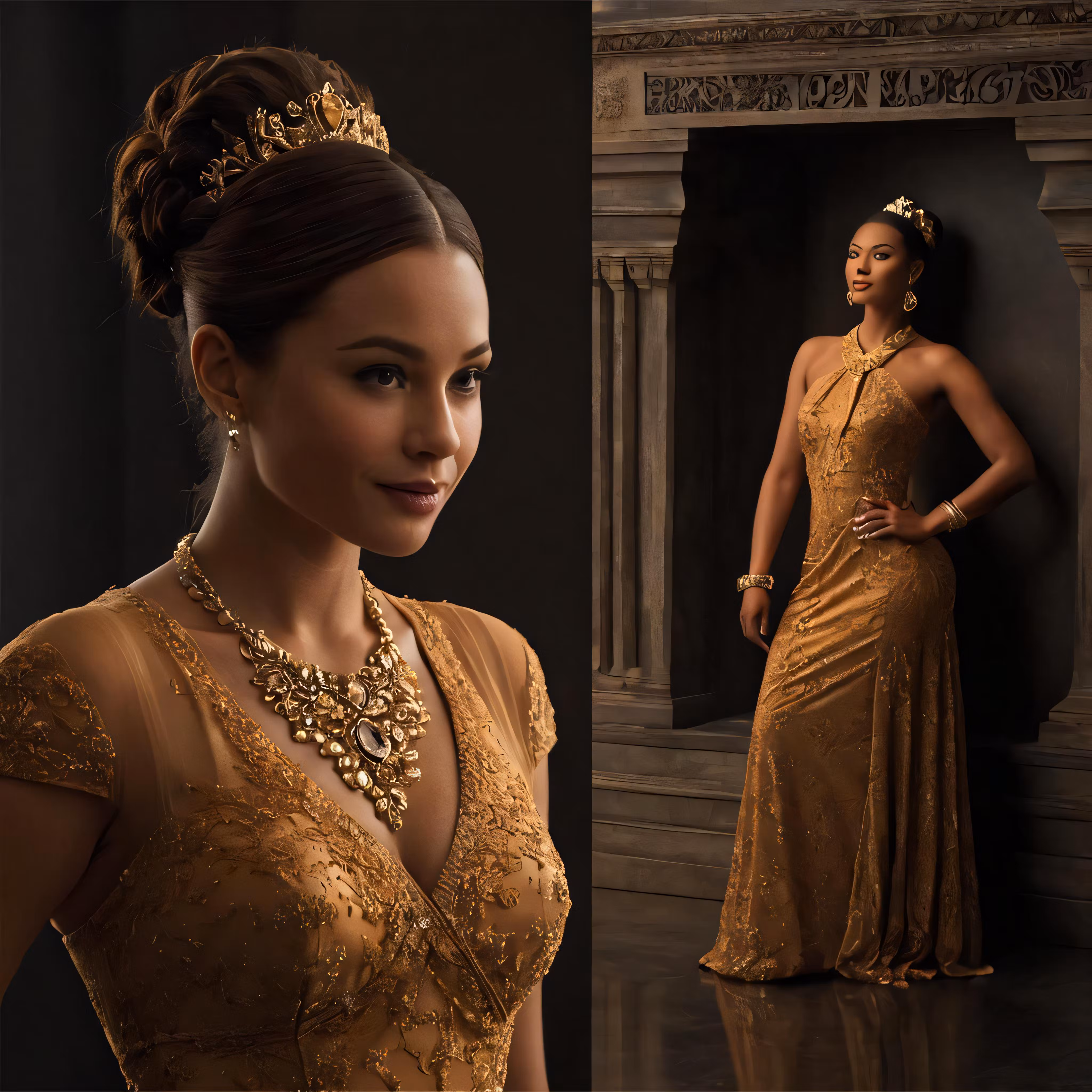 High resolution picture, free to use, a woman in gold dress standing next to a mirror
