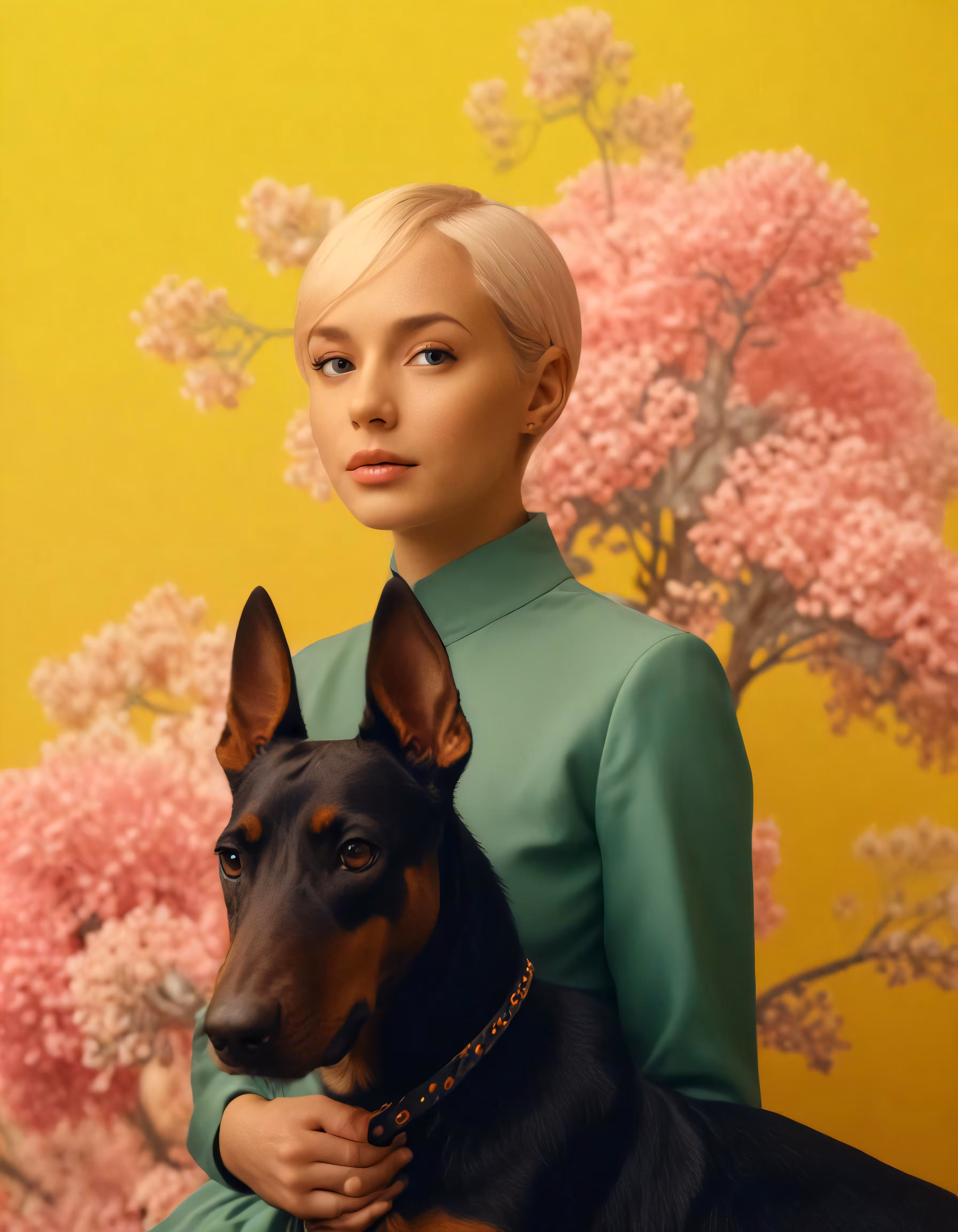 High resolution picture, free to use, a woman in green with a black and brown dog
