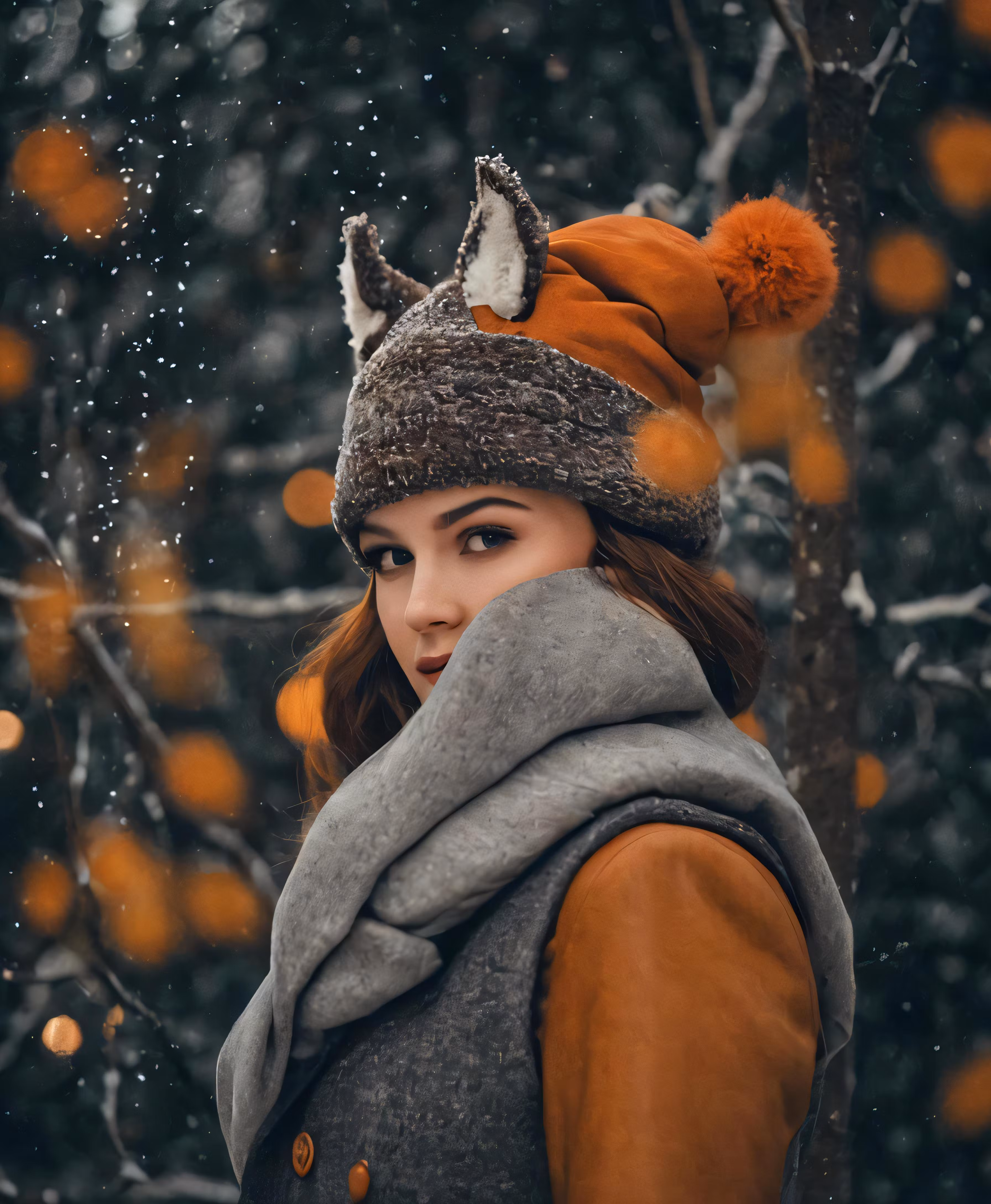High resolution picture, free to use, a woman in grey coat and hat next to orange tree
